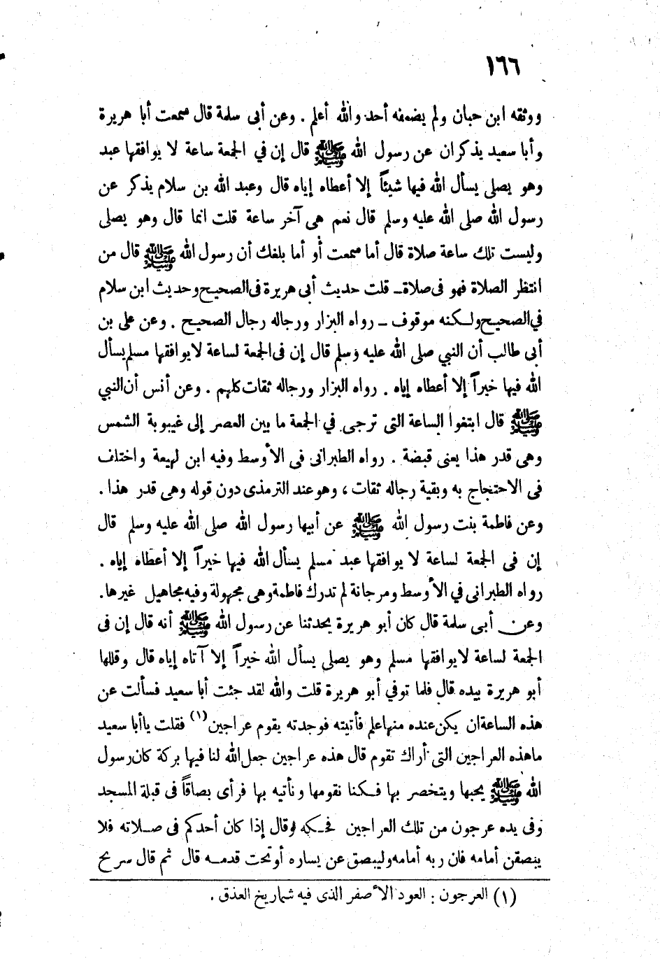 قَالَ: وَقَلَّلَهَا أَبُو هُرَيْرَةَ بِيَدِهِ قَالَ: فَلَمَّا تُوُفِّيَ أَبُو هُرَيْرَةَ قُلْتُ: وَاللَّهِ لَقَدْ جِئْتُ أَبَا سَعِيدٍ فَسَأَلْتُهُ عَنْ هَذِهِ السَّاعَةِ إِنْ يَكُنْ عِنْدَهُ مِنْهَا عَلَمٌ فَأَتَيْتُهُ فَوَجَدْتُهُ يُقَوِّمُ عَرَاجِينَ فَقُلْتُ: يَا أَبَا سَعِيدٍ مَا هَذِهِ الْعَرَاجِينُ الَّتِي أَرَاكَ تُقَوِّمُ؟ قَالَ: هَذِهِ عَرَاجِينُ جَعَلَ اللَّهُ لَنَا فِيهَا بَرَكَةً، كَانَ رَسُولُ اللَّهِ - صَلَّى اللَّهُ عَلَيْهِ وَسَلَّمَ - يُحِبُّهَا وَيَتَخَصَّرُ بِهَا، فَكُنَّا نُقَوِّمُهَا وَنَأْتِيهِ بِهَا، فَرَأَى بُصَاقًا فِي قِبْلَةِ الْمَسْجِدِ وَفِي يَدِهِ عُرْجُونٌ مِنْ تِلْكَ الْعَرَاجِينِ فَحَكَّهُ وَقَالَ: " إِذَا كَانَ أَحَدُكُمْ فِي صَلَاتِهِ فَلَا يَبْصُقَنَّ أَمَامَهُ فَإِنَّ رَبَّهُ أَمَامَهُ وَلْيَبْصُقْ عَنْ يَسَارِهِ أَوْ تَحْتَ قَدَمِهِ "، قَالَ: ثُمَّ قَالَ سَرِيحٌ