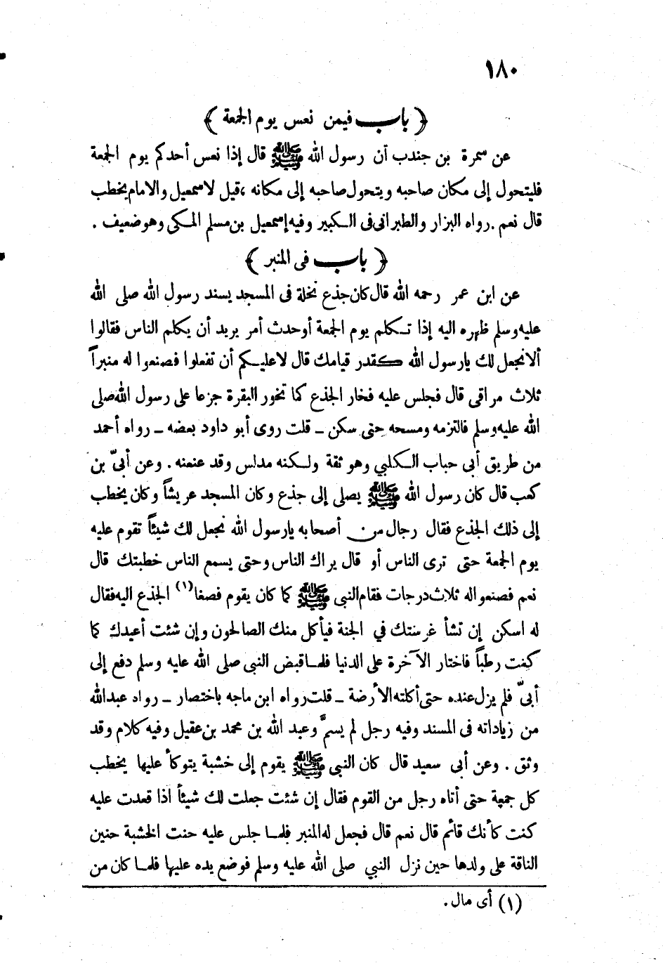 3098 - عَنِ ابْنِ عُمَرَ - رَحِمَهُ اللَّهُ - قَالَ: «كَانَ جِذْعُ نَخْلَةٍ فِي الْمَسْجِدِ يُسْنِدُ رَسُولُ اللَّهِ - صَلَّى اللَّهُ عَلَيْهِ وَسَلَّمَ - ظَهْرَهُ إِلَيْهِ إِذَا تَكَلَّمَ يَوْمَ الْجُمُعَةِ أَوْ حَدَثَ أَمْرٌ يُرِيدُ أَنْ يُكَلِّمَ النَّاسَ فَقَالُوا: أَلَا نَجْعَلُ لَكَ يَا رَسُولَ اللَّهِ كَقَدْرِ قِيَامِكَ قَالَ: " لَا عَلَيْكُمْ أَنْ تَفْعَلُوا " فَصَنَعُوا لَهُ مِنْبَرًا ثَلَاثَ مَرَاقٍ، فَجَلَسَ عَلَيْهِ فَخَارَ كَمَا تَخُورُ الْبَقَرَةُ جَزَعًا عَلَى رَسُولِ اللَّهِ - صَلَّى اللَّهُ عَلَيْهِ وَسَلَّمَ - فَالْتَزَمَهُ وَمَسَحَهُ حَتَّى سَكَنَ».