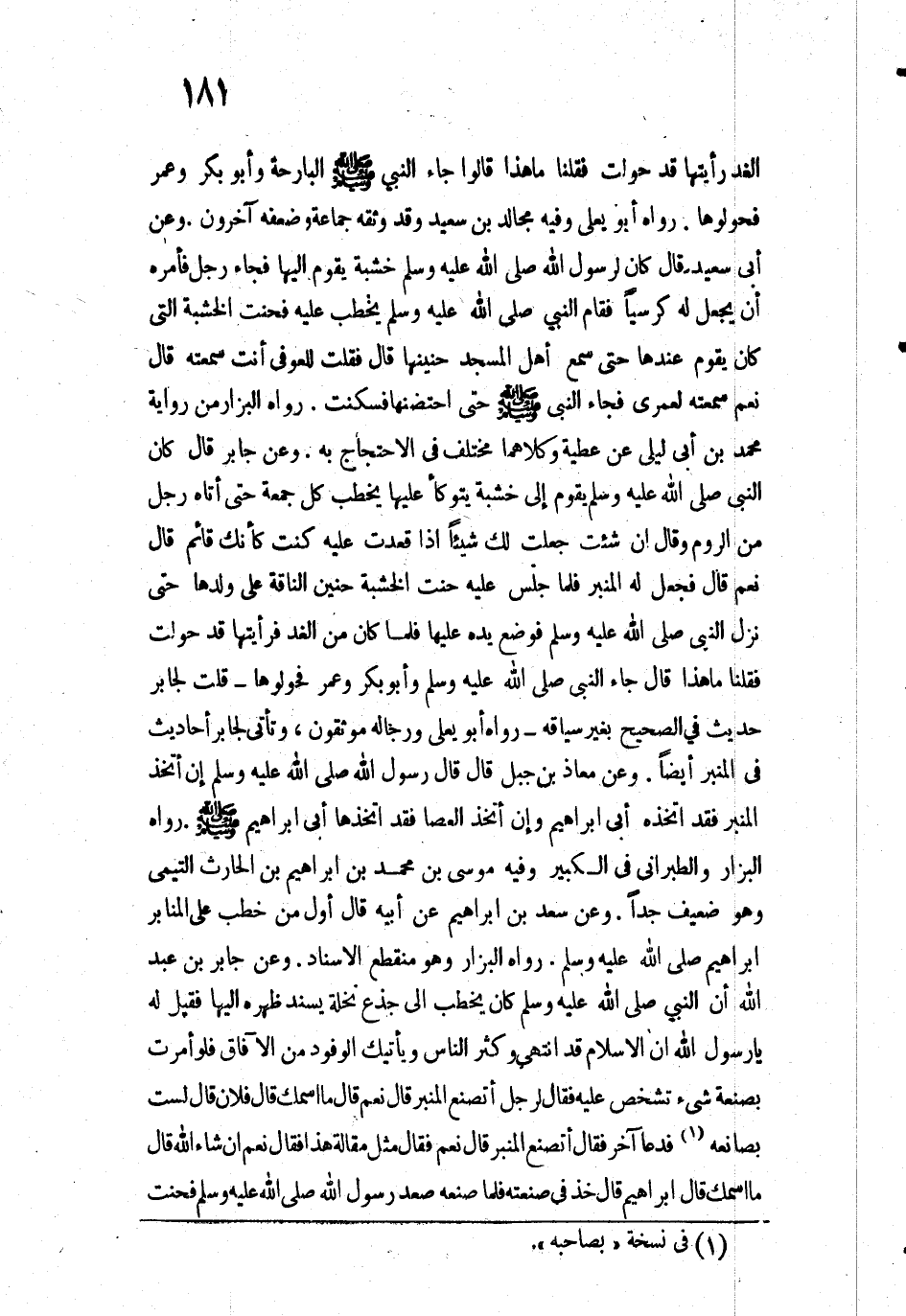3105 - وَعَنْ جَابِرِ بْنِ عَبْدِ اللَّهِ «أَنَّ النَّبِيَّ - صَلَّى اللَّهُ عَلَيْهِ وَسَلَّمَ - كَانَ يَخْطُبُ إِلَى جِذْعِ نَخْلَةٍ يُسْنِدُ ظَهْرَهُ إِلَيْهَا فَقِيلَ لَهُ: يَا رَسُولَ اللَّهِ إِنَّ الْإِسْلَامَ قَدِ انْتَهَى، وَكَثُرَ النَّاسُ وَيَأْتِيكَ الْوُفُودُ مِنَ الْآفَاقِ، فَلَوْ أَمَرْتَ بِصَنْعَةِ شَيْءٍ تَشْخَصُ عَلَيْهِ؟ فَقَالَ لِرَجُلٍ: "أَتَصْنَعُ الْمِنْبَرَ؟ " قَالَ: نَعَمْ قَالَ: " مَا اسْمُكَ؟ " قَالَ: فُلَانٌ قَالَ: " لَسْتَ بِصَانِعِهِ " فَدَعَا آخَرَ فَقَالَ: " أَتَصْنَعُ الْمِنْبَرَ؟ " قَالَ: نَعَمْ فَقَالَ مِثْلَ مَقَالَةِ هَذَا فَقَالَ: نَعَمْ إِنْ شَاءَ اللَّهُ قَالَ: " مَا اسْمُكَ؟ " قَالَ: إِبْرَاهِيمُ قَالَ: " خُذْ فِي صَنْعَتِهِ" فَلَمَّا صَنَعَهُ صَعِدَ رَسُولُ اللَّهِ - صَلَّى اللَّهُ عَلَيْهِ وَسَلَّمَ - عَلَيْهِ فَحَنَّتِ
