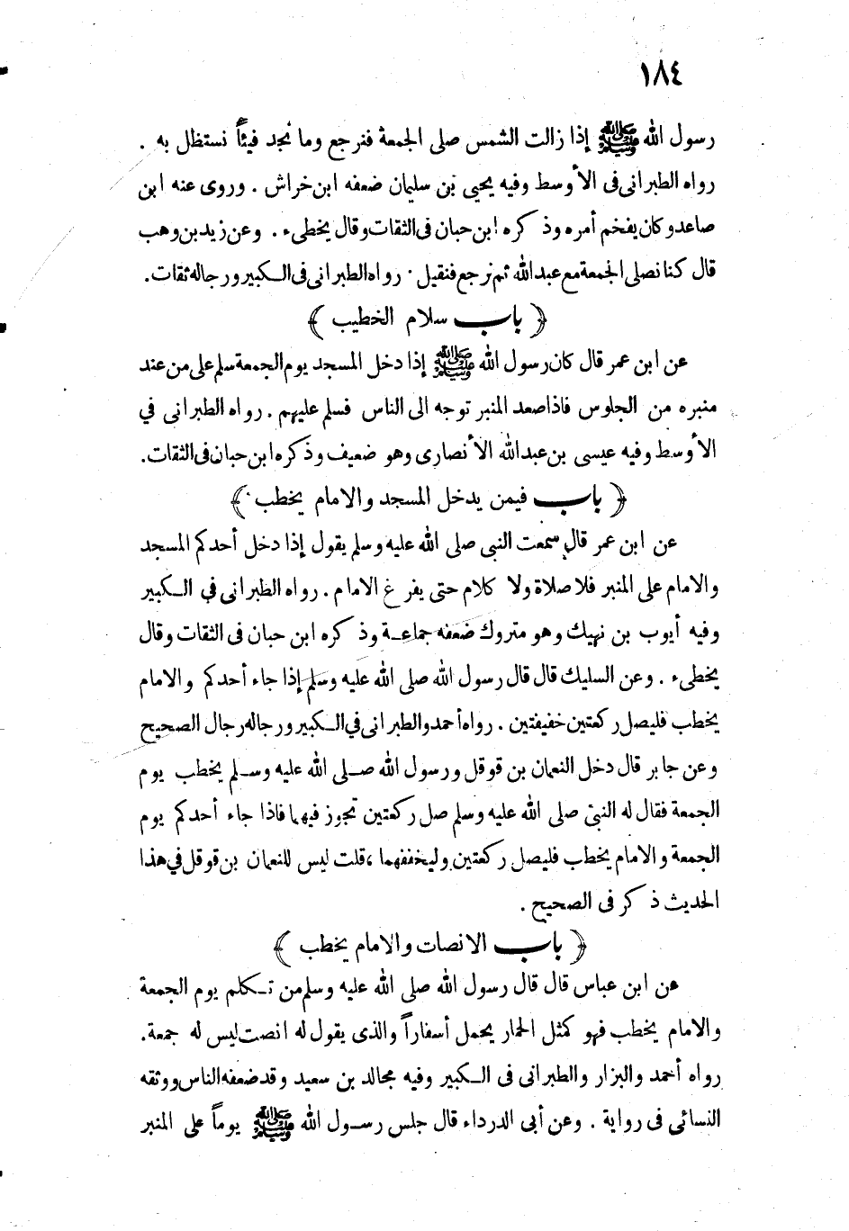 3119 - عَنِ ابْنِ عُمَرَ قَالَ: «كَانَ رَسُولُ اللَّهِ - صَلَّى اللَّهُ عَلَيْهِ وَسَلَّمَ - إِذَا دَخَلَ الْمَسْجِدَ يَوْمَ الْجُمُعَةِ سَلَّمَ عَلَى مَنْ عِنْدَ مِنْبَرِهِ مِنَ الْجُلُوسِ فَإِذَا صَعِدَ الْمِنْبَرَ تَوَجَّهَ إِلَى النَّاسِ فَسَلَّمَ عَلَيْهِمْ».