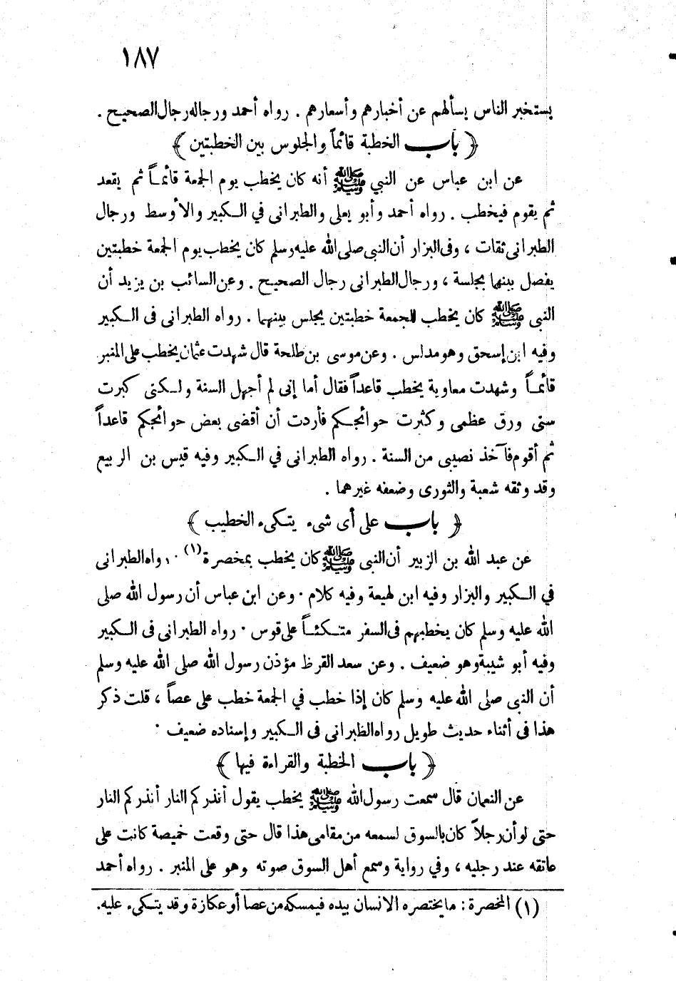 3138 - وَفِي الْبَزَّارِ «أَنَّ النَّبِيَّ - صَلَّى اللَّهُ عَلَيْهِ وَسَلَّمَ - كَانَ يَخْطُبُ يَوْمَ الْجُمُعَةِ خُطْبَتَيْنِ يَفْصِلُ بَيْنَهُمَا بِجِلْسَةٍ».
