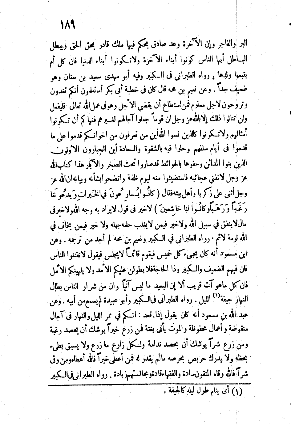 الْبَرُّ وَالْفَاجِرُ، وَإِنَّ الْآخِرَةَ وَعْدٌ صَادِقٌ يَحْكُمُ فِيهَا مَلِكٌ قَادِرٌ يُحِقُّ الْحَقَّ وَيُبْطِلُ الْبَاطِلَ، أَيُّهَا النَّاسُ كُونُوا أَبْنَاءَ الْآخِرَةِ وَلَا تَكُونُوا أَبْنَاءَ الدُّنْيَا فَإِنَّ كُلَّ أُمٍّ يَتْبَعُهَا وَلَدُهَا» " رَوَاهُ الطَّبَرَانِيُّ فِي الْكَبِيرِ وَفِيهِ أَبُو مَهْدِيٍّ سَعِيدُ بْنُ سِنَانٍ وَهُوَ ضَعِيفٌ جِدًّا
