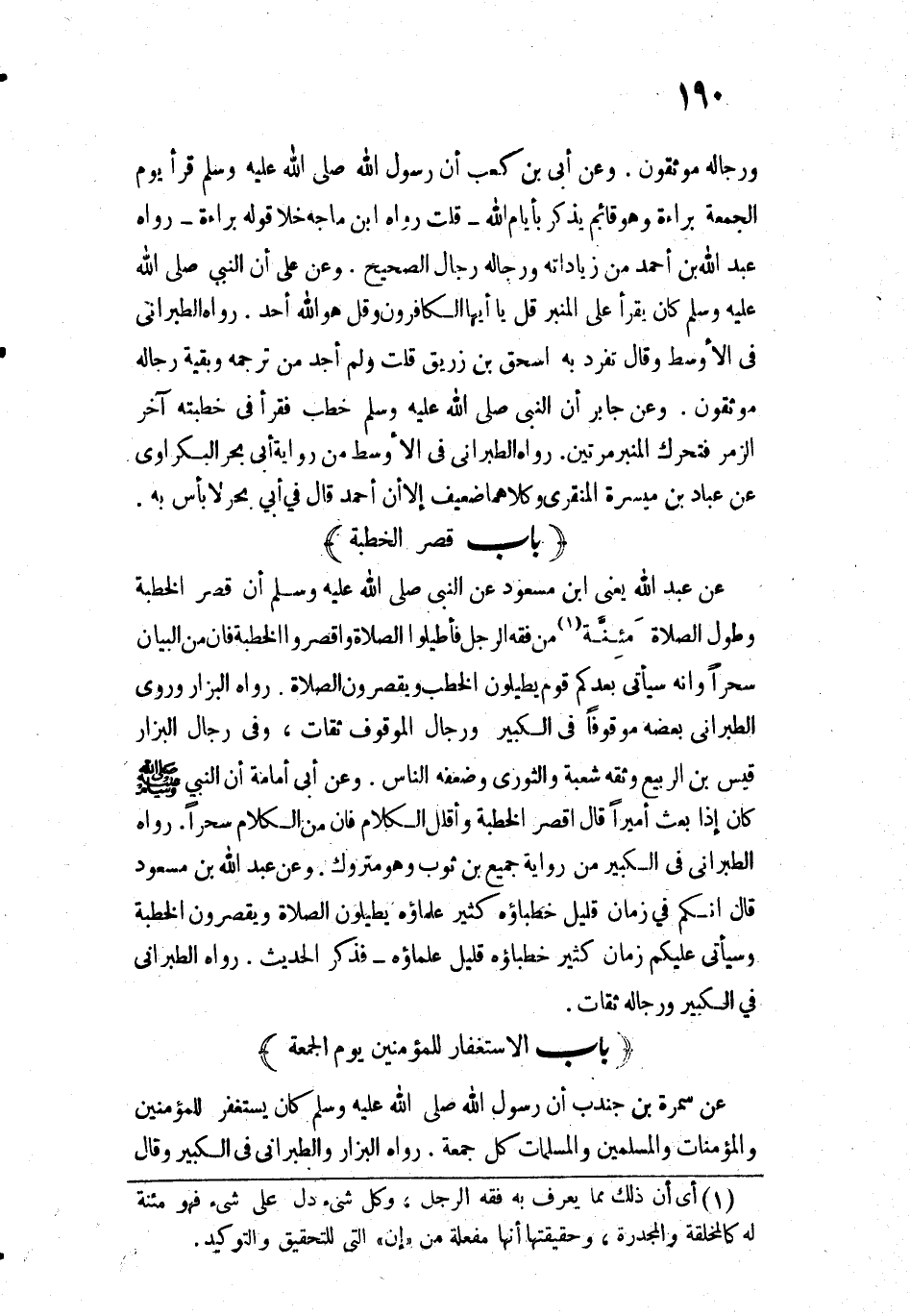 3158 - عَنْ عَبْدِ اللَّهِ - يَعْنِي ابْنَ مَسْعُودٍ - عَنِ النَّبِيِّ - صَلَّى اللَّهُ عَلَيْهِ وَسَلَّمَ -: " «أَنَّ قِصَرَ الْخُطْبَةِ وَطُولَ الصَّلَاةِ مَئِنَّةٌ مِنْ فِقْهِ الرَّجُلِ فَأَطِيلُوا الصَّلَاةَ وَاقْصُرُوا الْخُطْبَةَ فَإِنَّ مِنَ الْبَيَانِ سِحْرًا، وَإِنَّهُ سَيَأْتِي بَعْدَكُمْ قَوْمٌ يُطِيلُونَ الْخُطَبَ وَيَقْصُرُونَ الصَّلَاةَ» " رَوَاهُ الْبَزَّارُ، وَرَوَى الطَّبَرَانِيُّ بَعْضَهُ مَوْقُوفًا فِي الْكَبِيرِ وَرِجَالُ الْمَوْقُوفِ ثِقَاتٌ، وَفِي رِجَالِ الْبَزَّارِ قَيْسُ بْنُ الرَّبِيعِ وَثَّقَهُ شُعْبَةُ وَالثَّوْرِيُّ وَضَعَّفَهُ النَّاسُ