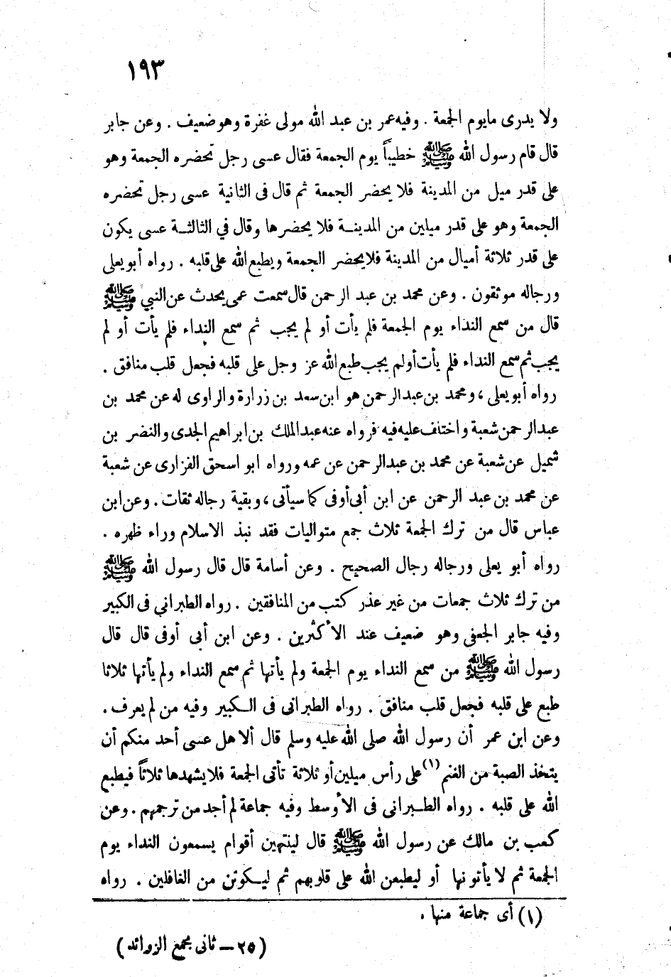 3175 - وَعَنْ جَابِرٍ قَالَ: «قَامَ رَسُولُ اللَّهِ - صَلَّى اللَّهُ عَلَيْهِ وَسَلَّمَ - خَطِيبًا يَوْمَ الْجُمُعَةِ فَقَالَ: "عَسَى رَجُلٌ تَحْضُرُهُ الْجُمُعَةُ وَهُوَ عَلَى قَدْرِ مِيلٍ مِنَ الْمَدِينَةِ فَلَا يَحْضُرُ الْجُمُعَةَ"، ثُمَّ قَالَ فِي الثَّانِيَةِ: " عَسَى رَجُلٌ تَحْضُرُهُ الْجُمُعَةُ وَهُوَ عَلَى قَدْرِ مِيلَيْنِ مِنَ الْمَدِينَةِ فَلَا يَحْضُرُهَا "، وَقَالَ فِي الثَّالِثَةِ: " عَسَى يَكُونُ عَلَى قَدْرِ ثَلَاثَةِ أَمْيَالٍ مِنَ الْمَدِينَةِ فَلَا يَحْضُرُ الْجُمُعَةَ وَيَطْبَعُ اللَّهُ عَلَى قَلْبِهِ» " رَوَاهُ أَبُو يَعْلَى وَرِجَالُهُ مُوَثَّقُونَ