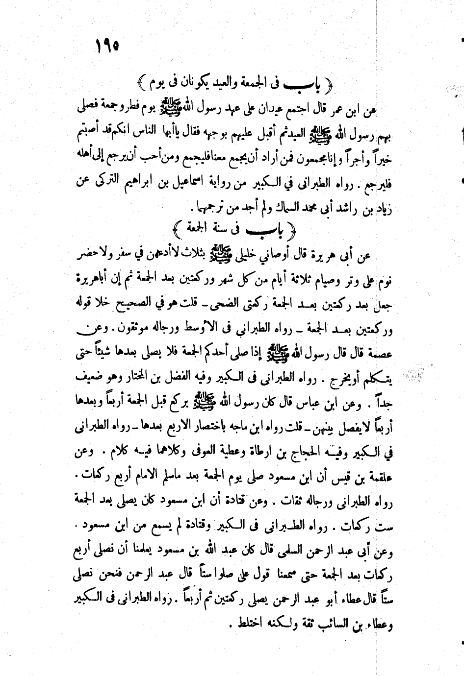 3187 - عَنِ ابْنِ عُمَرَ قَالَ: «اجْتَمَعَ عِيدَانِ عَلَى عَهْدِ رَسُولِ اللَّهِ - صَلَّى اللَّهُ عَلَيْهِ وَسَلَّمَ - يَوْمُ فِطْرٍ وَجُمُعَةٌ فَصَلَّى بِهِمْ رَسُولُ اللَّهِ - صَلَّى اللَّهُ عَلَيْهِ وَسَلَّمَ - الْعِيدَ، ثُمَّ أَقْبَلَ عَلَيْهِمْ بِوَجْهِهِ فَقَالَ: "يَا أَيُّهَا النَّاسُ إِنَّكُمْ قَدْ أَصَبْتُمْ خَيْرًا وَأَجْرًا وَإِنَّا مُجَمِّعُونَ فَمَنْ أَرَادَ أَنْ يُجَمِّعَ مَعَنَا فَلْيُجَمِّعْ وَمَنْ أَحَبَّ أَنْ يَرْجِعَ إِلَى أَهْلِهِ فَلْيَرْجِعْ» " رَوَاهُ الطَّبَرَانِيُّ فِي الْكَبِيرِ مِنْ رِوَايَةِ إِسْمَاعِيلَ بْنِ إِبْرَاهِيمَ التُّرْكِيِّ عَنْ زِيَادِ بْنِ رَاشِدٍ أَبِي مُحَمَّدٍ السَّمَّاكِ وَلَمْ أَجِدْ مَنْ تَرْجَمَهُمَا