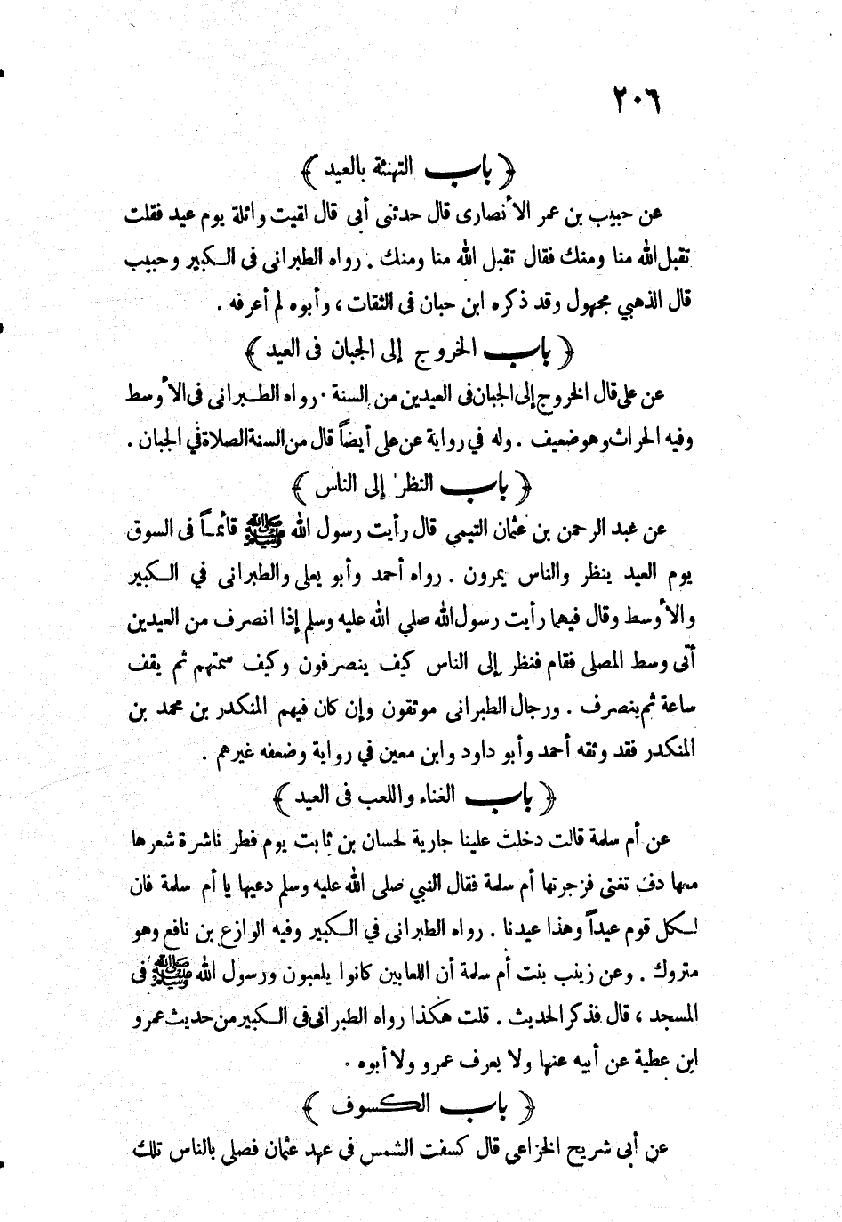 3258 - عَنْ عَبْدِ الرَّحْمَنِ بْنِ عُثْمَانَ التَّيْمِيِّ قَالَ: «رَأَيْتُ رَسُولَ اللَّهِ - صَلَّى اللَّهُ عَلَيْهِ وَسَلَّمَ - قَائِمًا فِي السُّوقِ يَوْمَ الْعِيدِ يَنْظُرُ وَالنَّاسُ يَمُرُّونَ» رَوَاهُ أَحْمَدُ، وَأَبُو يَعْلَى، وَالْطَبَرَانِيُّ فِي الْكَبِيرِ وَالْأَوْسَطِ وَقَالَ فِيهِمَا: «رَأَيْتُ رَسُولَ اللَّهِ - صَلَّى اللَّهُ عَلَيْهِ وَسَلَّمَ - إِذَا انْصَرَفَ مِنَ الْعِيدَيْنِ أَتَى وَسَطَ الْمُصَلَّى فَقَامَ فَنَظَرَ [إِلَى] النَّاسِ كَيْفَ يَنْصَرِفُونَ وَكَيْفَ سَمْتُهُمْ ثُمَّ يَقِفُ سَاعَةً ثُمَّ يَنْصَرِفُ» وَرِجَالُ الطَّبَرَانِيِّ مُوَثَّقُونَ وَإِنْ كَانَ فِيهِمُ الْمُنْكَدِرُ بْنُ مُحَمَّدِ بْنِ الْمُنْكَدِرِ فَقَدْ وَثَّقَهُ أَحْمَدُ وَأَبُو دَاوُدَ وَابْنُ مَعِينٍ فِي رِوَايَةٍ وَضَعَّفَهُ غَيْرُهُمْ