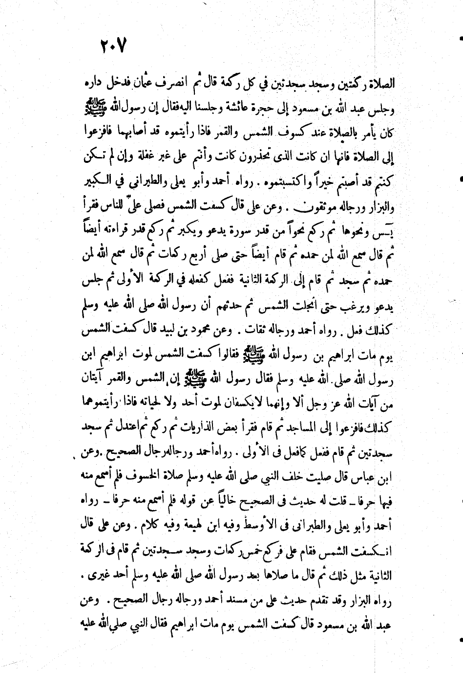 الصَّلَاةَ رَكْعَتَيْنِ وَسَجَدَ سَجْدَتَيْنِ فِي كُلِّ رَكْعَةٍ قَالَ: ثُمَّ انْصَرَفَ عُثْمَانُ فَدَخَلَ دَارَهُ وَجَلَسَ عَبْدُ اللَّهِ بْنُ مَسْعُودٍ إِلَى حُجْرَةِ عَائِشَةَ وَجَلَسْنَا إِلَيْهِ فَقَالَ: إِنَّ رَسُولَ اللَّهِ - صَلَّى اللَّهُ عَلَيْهِ وَسَلَّمَ - كَانَ يَأْمُرُ بِالصَّلَاةِ عِنْدَ كُسُوفِ الشَّمْسِ وَالْقَمَرِ فَإِذَا رَأَيْتُمُوهُ قَدْ أَصَابَهُمَا فَافْزَعُوا إِلَى الصَّلَاةِ فَإِنَّهَا إِنْ كَانَتِ الَّذِي تَحْذَرُونَ كَانَتْ وَأَنْتُمْ عَلَى غَيْرِ غَفْلَةٍ، وَإِنْ لَمْ تَكُنْ كُنْتُمْ قَدْ أَصَبْتُمْ خَيْرًا وَاكْتَسَبْتُمُوهُ» رَوَاهُ أَحْمَدُ وَأَبُو يَعْلَى وَالْطَبَرَانِيُّ فِي الْكَبِيرِ وَالْبَزَّارُ، وَرِجَالُهُ مُوَثَّقُونَ