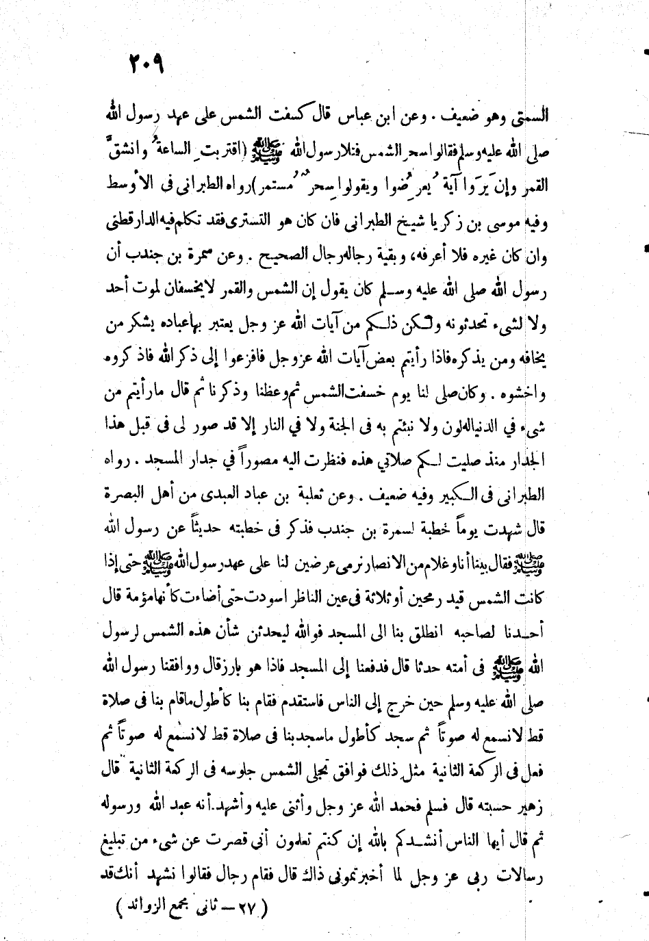 3271 - وَعَنِ ابْنِ عَبَّاسٍ قَالَ: «كَسَفَتِ الشَّمْسُ عَلَى عَهْدِ رَسُولِ اللَّهِ - صَلَّى اللَّهُ عَلَيْهِ وَسَلَّمَ - فَقَالُوا: سِحْرُ الشَّمْسِ فَتَلَا رَسُولُ اللَّهِ - صَلَّى اللَّهُ عَلَيْهِ وَسَلَّمَ - {اقْتَرَبَتِ السَّاعَةُ وَانْشَقَّ الْقَمَرُ - وَإِنْ يَرَوْا آيَةً يُعْرِضُوا وَيَقُولُوا سِحْرٌ مُسْتَمِرٌّ} [القمر: 1 - 2]» رَوَاهُ الطَّبَرَانِيُّ فِي الْأَوْسَطِ، وَفِيهِ مُوسَى بْنُ زَكَرِيَّا شَيْخُ الطَّبَرَانِيِّ فَإِنْ كَانَ هُوَ التُّسْتَرِيَّ فَقَدْ تَكَلَّمَ فِيهِ الدَّارَقُطْنِيُّ وَإِنْ كَانَ غَيْرَهُ فَلَا أَعْرِفُهُ، وَبَقِيَّةُ رِجَالِهِ رِجَالُ الصَّحِيحِ
