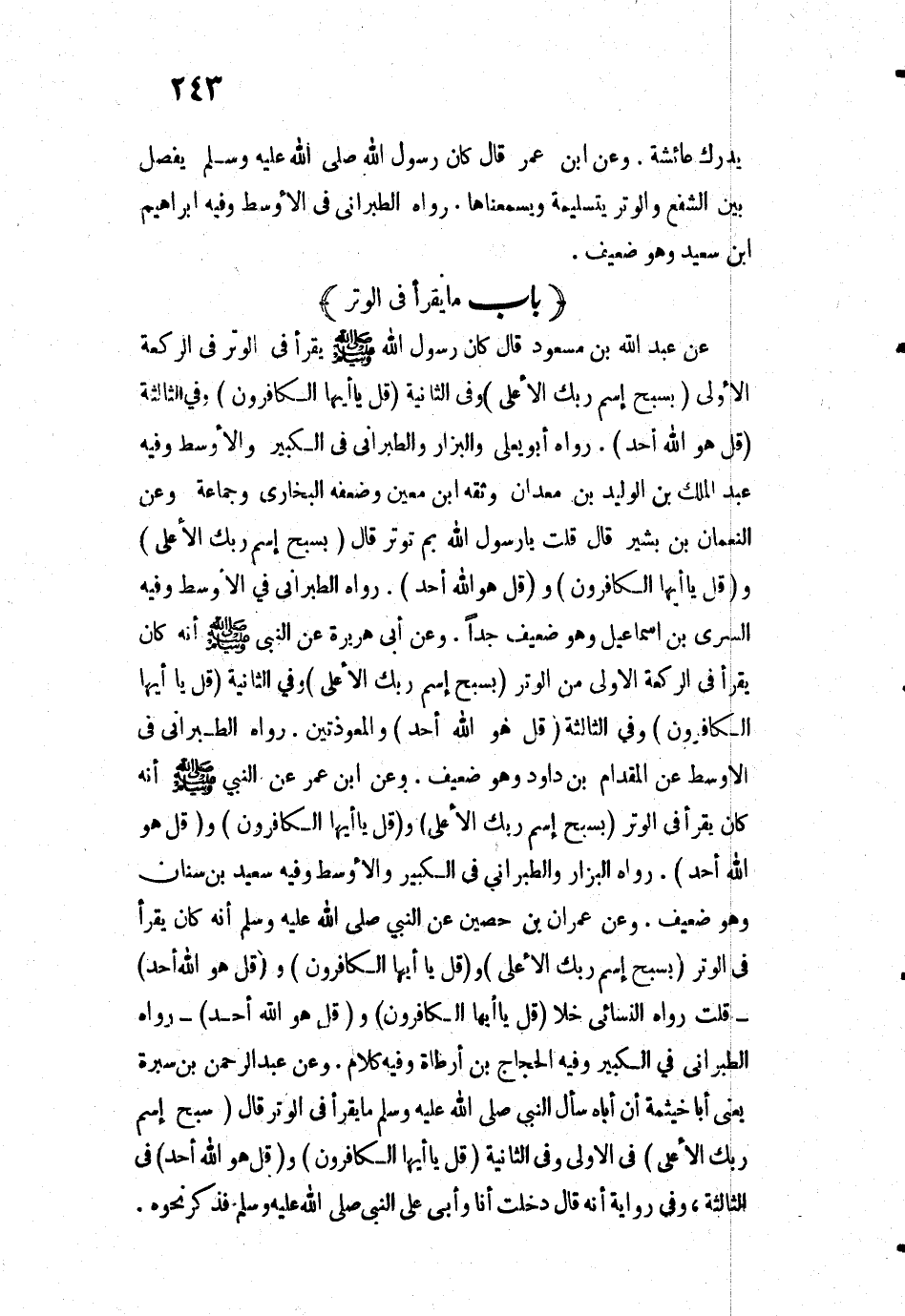 3469 - «وَعَنْ عَبْدِ الرَّحْمَنِ بْنِ سَبْرَةَ - يَعْنِي أَبَا خَيْثَمَةَ - أَنَّ أَبَاهُ سَأَلَ النَّبِيَّ - صَلَّى اللَّهُ عَلَيْهِ وَسَلَّمَ - مَا يَقْرَأُ فِي الْوِتْرِ قَالَ: " سَبِّحِ اسْمَ رَبِّكَ الْأَعْلَى فِي الْأُولَى، وَفِي الثَّانِيَةِ: قُلْ يَا أَيُّهَا الْكَافِرُونَ وَقُلْ هُوَ اللَّهُ أَحَدٌ فِي الثَّالِثَةِ».