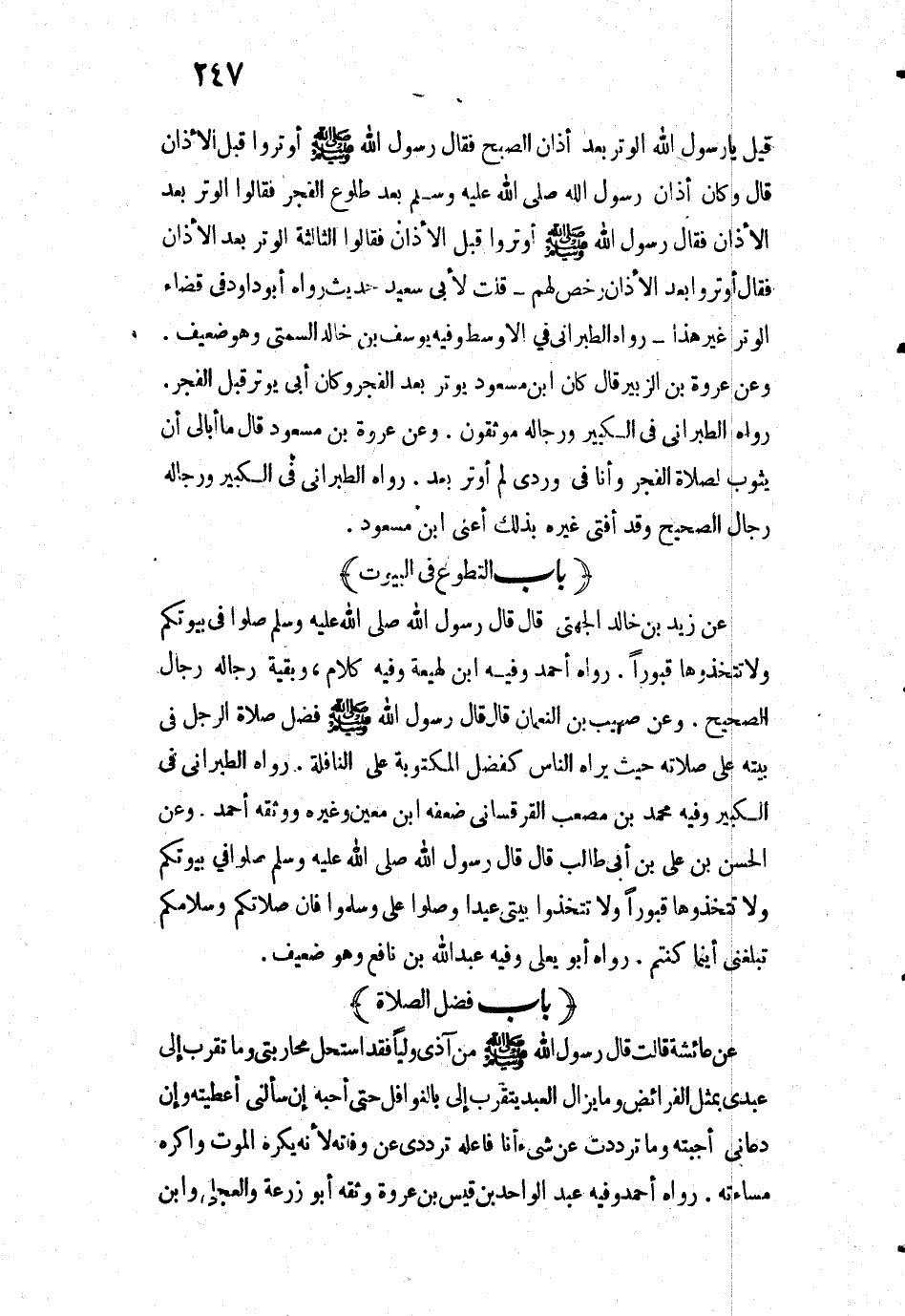 «قِيلَ: يَا رَسُولَ اللَّهِ الْوِتْرُ بَعْدَ أَذَانِ الصُّبْحِ؟ فَقَالَ رَسُولُ اللَّهِ - صَلَّى اللَّهُ عَلَيْهِ وَسَلَّمَ -: " أَوْتِرُوا قَبْلَ الْأَذَانِ " قَالَ: وَكَانَ أَذَانُ رَسُولِ اللَّهِ - صَلَّى اللَّهُ عَلَيْهِ وَسَلَّمَ - بَعْدَ طُلُوعِ الْفَجْرِ فَقَالُوا: الْوِتْرُ بَعْدَ الْأَذَانِ؟ فَقَالَ رَسُولُ اللَّهِ - صَلَّى اللَّهُ عَلَيْهِ وَسَلَّمَ -: " أَوْتِرُوا قَبْلَ الْأَذَانِ " فَقَالُوا الثَّالِثَةَ: الْوِتْرُ بَعْدَ الْأَذَانِ؟ فَقَالَ: " أَوْتِرُوا بَعْدَ الْأَذَانِ " رَخَّصَ لَهُمْ».