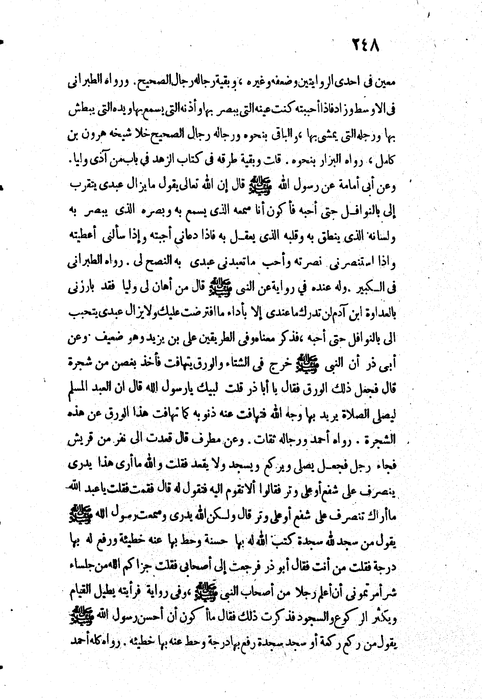 مَعِينٍ فِي إِحْدَى الرِّوَايَتَيْنِ وَضَعَّفَهُ وَغَيْرُهُ، وَبَقِيَّةُ رِجَالِهِ رِجَالُ الصَّحِيحِ وَرَوَاهُ الطَّبَرَانِيُّ فِي الْأَوْسَطِ وَزَادَ: " «فَإِذَا أَحْبَبْتُهُ كُنْتُ عَيْنَهُ الَّتِي يُبْصِرُ بِهَا وَأُذُنَهُ الَّتِي يَسْمَعُ بِهَا وَيَدَهُ الَّتِي يَبْطِشُ بِهَا وَرِجْلَهُ الَّتِي يَمْشِي بِهَا» " وَالْبَاقِي بِنَحْوِهِ، وَرِجَالُهُ رِجَالُ الصَّحِيحِ خَلَا شَيْخَهُ هَارُونَ بْنَ كَامِلٍ رَوَاهُ الْبَزَّارُ بِنَحْوِهِ.