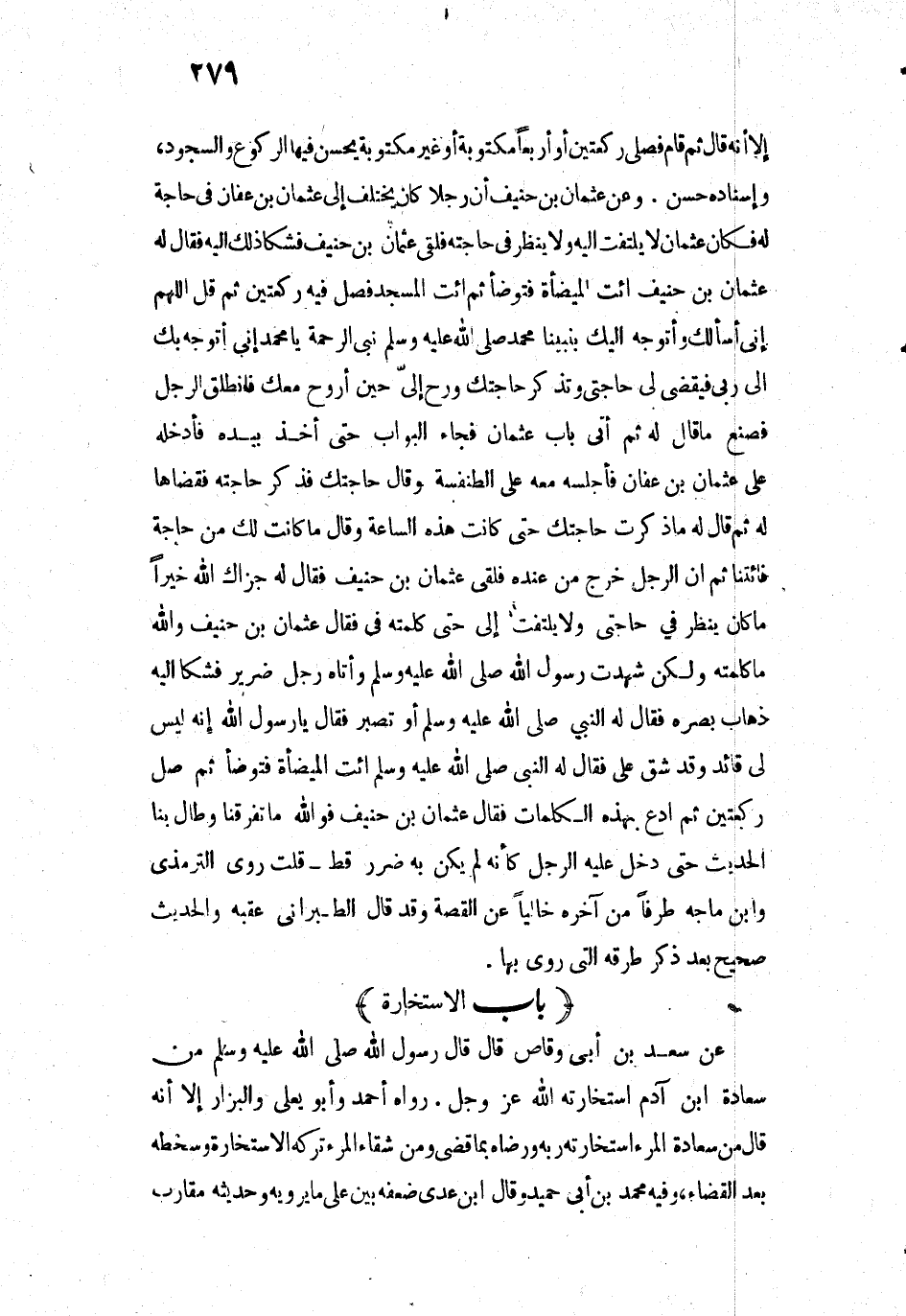 3668 - وَعَنْ عُثْمَانَ بْنِ حُنَيْفٍ أَنَّ رَجُلًا كَانَ يَخْتَلِفُ إِلَى عُثْمَانَ بْنِ عَفَّانَ فِي حَاجَةٍ لَهُ فَكَانَ عُثْمَانُ لَا يَلْتَفِتُ إِلَيْهِ وَلَا يَنْظُرُ فِي حَاجَتِهِ فَلَقِيَ عُثْمَانَ بْنَ حُنَيْفٍ فَشَكَا ذَلِكَ إِلَيْهِ فَقَالَ لَهُ عُثْمَانُ بْنُ حُنَيْفٍ: ائْتِ الْمِيضَأَةَ فَتَوَضَّأْ ثُمَّ ائْتِ الْمَسْجِدَ فَصَلِّ فِيهِ رَكْعَتَيْنِ، ثُمَّ قُلِ: اللَّهُمَّ إِنِّي أَسْأَلُكَ وَأَتَوَجَّهُ إِلَيْكَ بِنَبِيِّنَا مُحَمَّدٍ - صَلَّى اللَّهُ عَلَيْهِ وَسَلَّمَ - نَبِيِّ الرَّحْمَةِ، يَا مُحَمَّدُ إِنِّي أَتَوَجَّهُ بِكَ إِلَى رَبِّي فَيَقْضِي لِي حَاجَتِي، وَتَذْكُرُ حَاجَتَكَ، وَرُحْ إِلَيَّ حِينَ أَرُوحُ مَعَكَ فَانْطَلَقَ الرَّجُلُ فَصَنَعَ مَا قَالَ لَهُ ثُمَّ أَتَى بَابَ عُثْمَانَ فَجَاءَ الْبَوَّابُ حَتَّى أَخَذَ بِيَدِهِ فَأَدْخَلَهُ عَلَى عُثْمَانَ بْنِ عَفَّانَ فَأَجْلَسَهُ مَعَهُ عَلَى الطِّنْفِسَةِ وَقَالَ: حَاجَتُكَ؟ فَذَكَرَ حَاجَتَهُ فَقَضَاهَا لَهُ ثُمَّ قَالَ لَهُ: مَا ذَكَرْتَ حَاجَتَكَ حَتَّى كَانَتْ هَذِهِ السَّاعَةُ، وَقَالَ: مَا كَانَتْ لَكَ مِنْ حَاجَةٍ فَائْتِنَا، ثُمَّ إِنَّ الرَّجُلَ خَرَجَ مِنْ عِنْدِهِ فَلَقِيَ عُثْمَانَ بْنَ حُنَيْفٍ فَقَالَ لَهُ: جَزَاكَ اللَّهُ خَيْرًا مَا كَانَ يَنْظُرُ فِي حَاجَتِي وَلَا يَلْتَفِتُ إِلَيَّ حَتَّى كَلَّمْتَهُ فِيَّ، فَقَالَ عُثْمَانُ بْنُ حُنَيْفٍ: وَاللَّهِ مَا كَلَّمْتُهُ وَلَكِنْ «شَهِدْتُ رَسُولَ اللَّهِ - صَلَّى اللَّهُ عَلَيْهِ وَسَلَّمَ - وَأَتَاهُ رَجُلٌ ضَرِيرٌ فَشَكَا إِلَيْهِ ذَهَابَ بَصَرِهِ فَقَالَ لَهُ النَّبِيُّ - صَلَّى اللَّهُ عَلَيْهِ وَسَلَّمَ -: " أَوَ تَصْبِرُ؟ " فَقَالَ: يَا رَسُولَ اللَّهِ إِنَّهُ لَيْسَ لِي قَائِدٌ وَقَدْ شَقَّ عَلَيَّ، فَقَالَ لَهُ النَّبِيُّ - صَلَّى اللَّهُ عَلَيْهِ وَسَلَّمَ -: " ائْتِ الْمِيضَأَةَ فَتَوَضَّأْ ثُمَّ صَلِّ رَكْعَتَيْنِ ثُمَّ ادْعُ بِهَذِهِ الْكَلِمَاتِ» فَقَالَ عُثْمَانُ بْنُ حُنَيْفٍ: فَوَاللَّهِ مَا تَفَرَّقْنَا وَطَالَ بِنَا الْحَدِيثُ حَتَّى دَخَلَ عَلَيْهِ الرَّجُلُ كَأَنَّهُ لَمْ يَكُنْ بِهِ ضَرَرٌ قَطُّ.