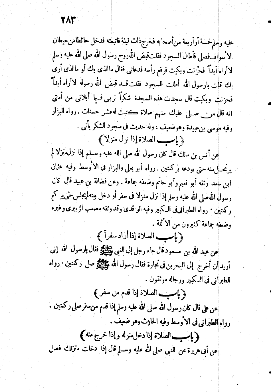 3685 - عَنْ عَلِيٍّ قَالَ: «كَانَ رَسُولُ اللَّهِ - صَلَّى اللَّهُ عَلَيْهِ وَسَلَّمَ - إِذَا قَدِمَ مِنْ سَفَرٍ صَلَّى رَكْعَتَيْنِ».