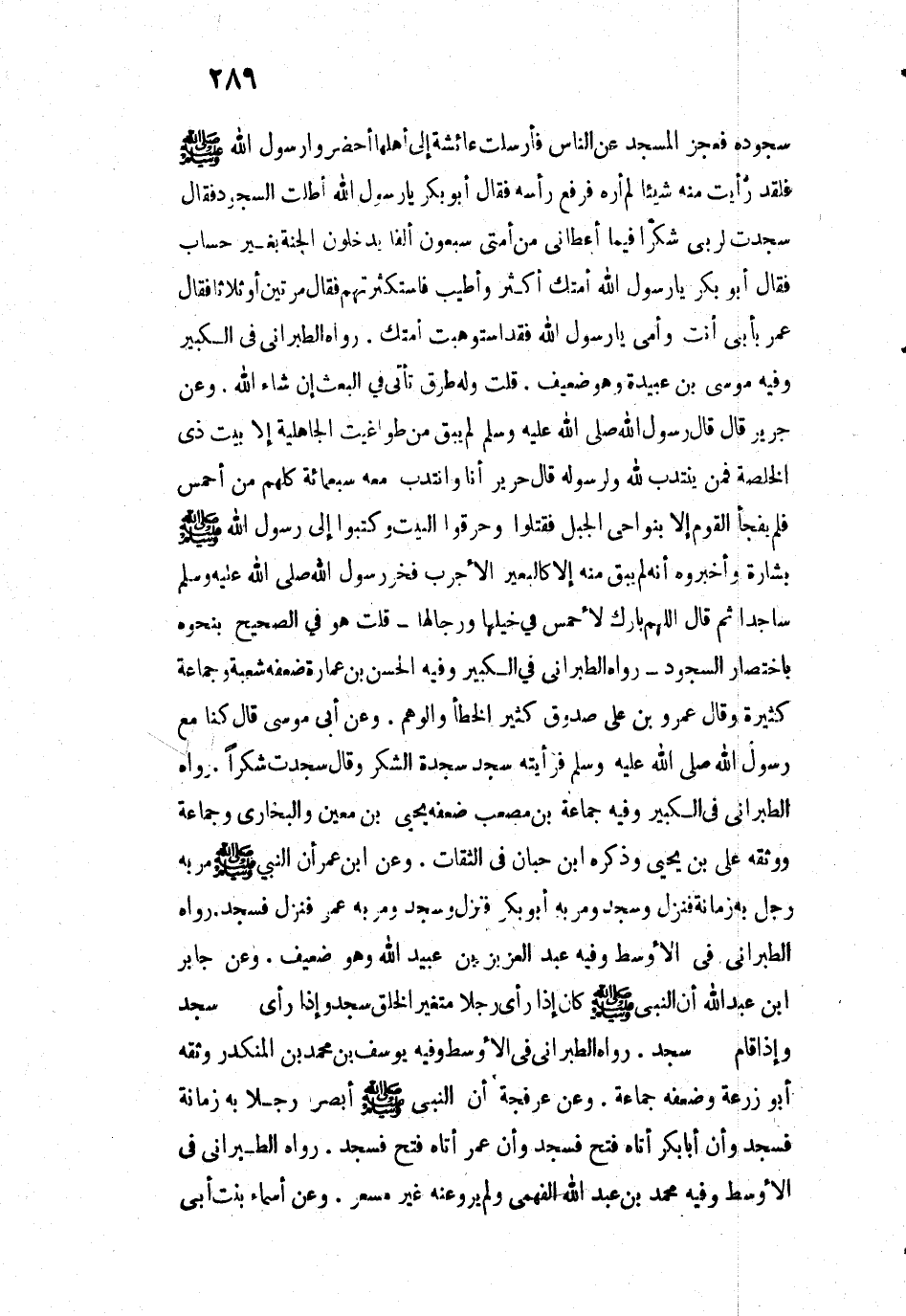 سُجُودَهُ فَعَجَزَ الْمَسْجِدُ عَنِ النَّاسِ فَأَرْسَلَتْ عَائِشَةُ إِلَى أَهْلِهَا احْضُرُوا رَسُولَ اللَّهِ - صَلَّى اللَّهُ عَلَيْهِ وَسَلَّمَ - فَلَقَدْ رَأَيْتُ مِنْهُ شَيْئًا لَمْ أَرَهُ فَرَفَعَ رَأْسَهُ، فَقَالَ أَبُو بَكْرٍ: يَا رَسُولَ اللَّهِ أَطَلْتَ السُّجُودَ؟ فَقَالَ: " سَجَدْتُ لِرَبِّي شُكْرًا فِيمَا أَعْطَانِي مِنْ أُمَّتِي سَبْعُونَ أَلْفًا يَدْخُلُونَ الْجَنَّةَ بِغَيْرِ حِسَابٍ " فَقَالَ أَبُو بَكْرٍ: يَا رَسُولَ اللَّهِ أُمَّتُكَ أَكْثَرُ وَأَطْيَبُ فَاسْتَكْثِرْ لَهُمْ فَقَالَ مَرَّتَيْنِ أَوْ ثَلَاثًا فَقَالَ عُمَرُ: بِأَبِي أَنْتَ وَأُمِّي يَا رَسُولَ اللَّهِ فَقَدِ اسْتَوْهَبْتَ أُمَّتَكَ!».