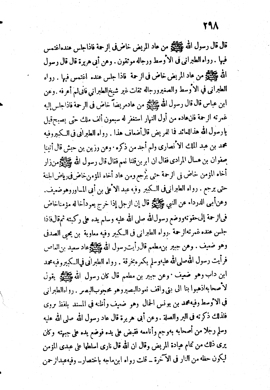 قَالَ: قَالَ رَسُولُ اللَّهِ - صَلَّى اللَّهُ عَلَيْهِ وَسَلَّمَ -: " «مَنْ عَادَ الْمَرِيضَ خَاضَ فِي الرَّحْمَةِ، فَإِذَا جَلَسَ عِنْدَهُ اغْتَمَسَ فِيهَا» ".