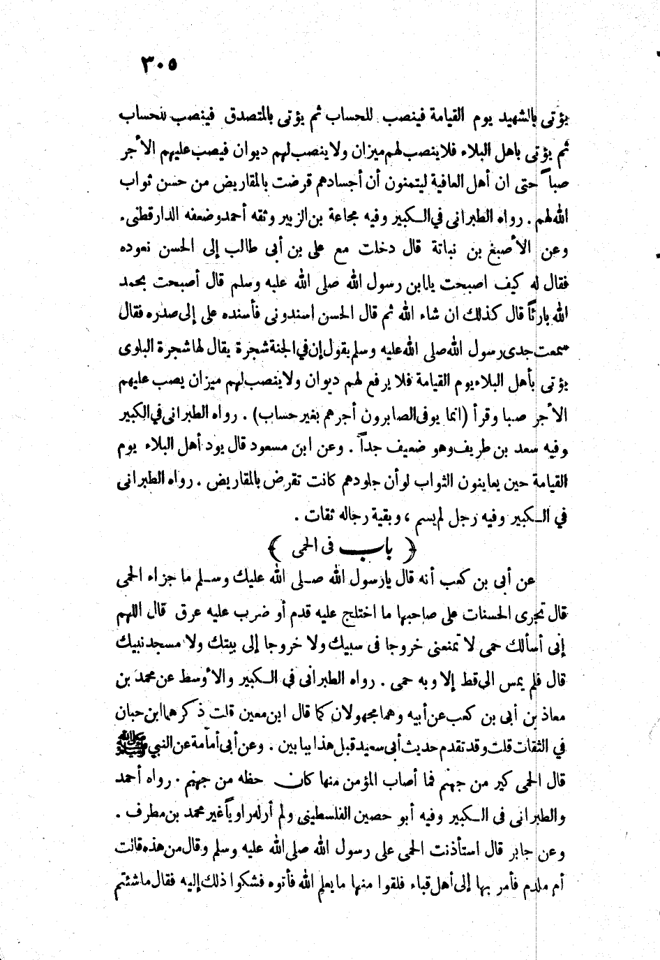 «يُؤْتَى بِالشَّهِيدِ يَوْمَ الْقِيَامَةِ فَيُنْصَبُ لِلْحِسَابِ، ثُمَّ يُؤْتَى بِالْمُتَصَدِّقِ فَيُنْصَبُ لِلْحِسَابِ، ثُمَّ يُؤْتَى بِأَهْلِ الْبَلَاءِ فَلَا يُنْصَبُ لَهُمْ مِيزَانٌ وَلَا يُنْصَبُ لَهُمْ دِيوَانٌ فَيُصَبُّ عَلَيْهِمُ الْأَجْرُ صَبًّا حَتَّى إِنَّ أَهْلَ الْعَافِيَةِ لِيَتَمَنَّوْنَ أَنَّ أَجْسَادَهُمْ قُرِّضَتْ بِالْمَقَارِيضِ مِنْ حُسْنِ ثَوَابِ اللَّهِ لَهُمْ».