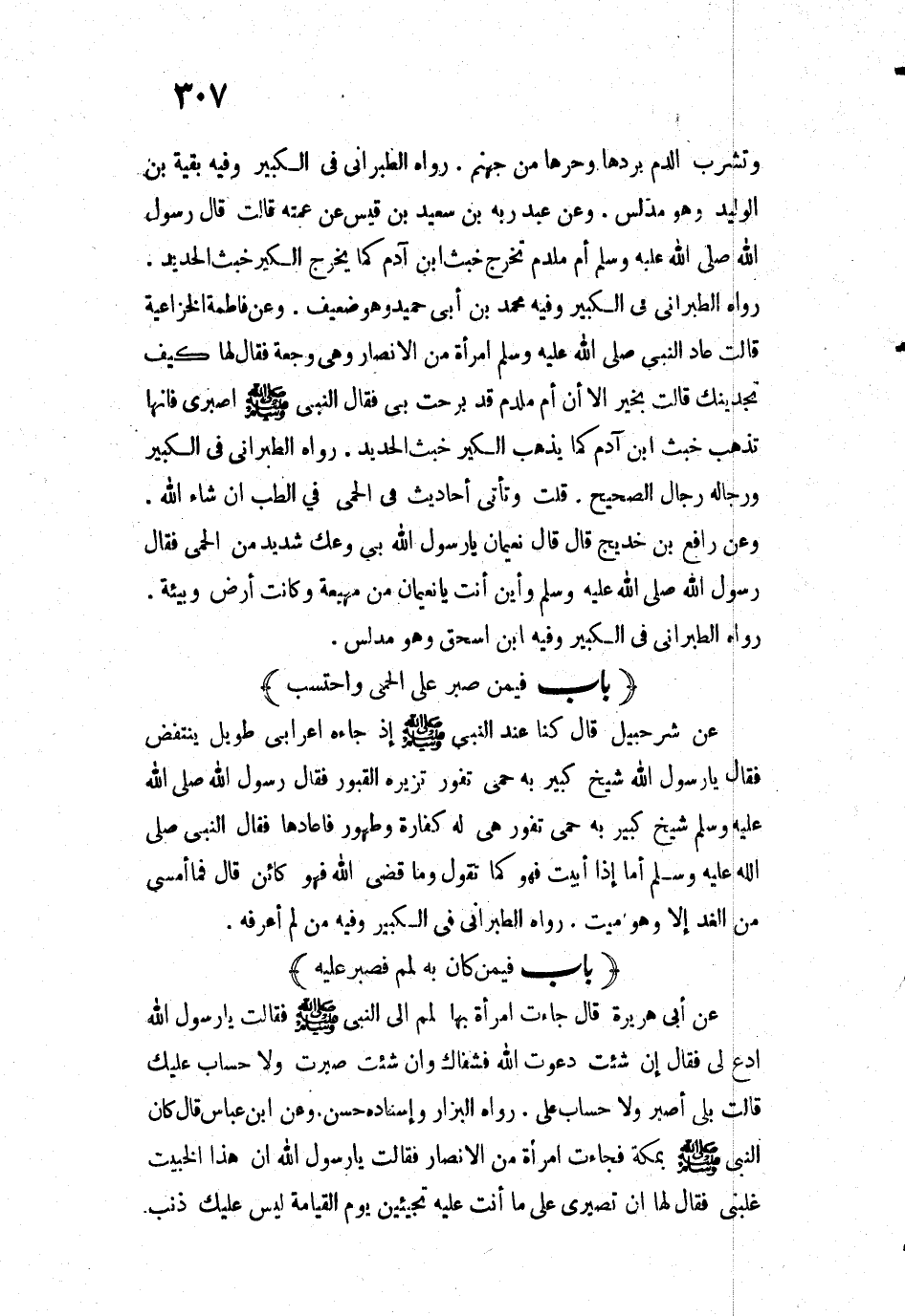3834 - عَنْ أَبِي هُرَيْرَةَ قَالَ: «جَاءَتِ امْرَأَةٌ بِهَا لَمَمٌ إِلَى النَّبِيِّ - صَلَّى اللَّهُ عَلَيْهِ وَسَلَّمَ - فَقَالَتْ: يَا رَسُولَ اللَّهِ ادْعُ لِي فَقَالَ: " إِنْ شِئْتِ دَعَوْتُ اللَّهَ فَشَفَاكِ، وَإِنْ شِئْتِ صَبَرْتِ وَلَا حِسَابَ عَلَيْكِ؟ "، قَالَتْ: بَلَى أَصْبِرُ وَلَا حِسَابَ عَلَيَّ».