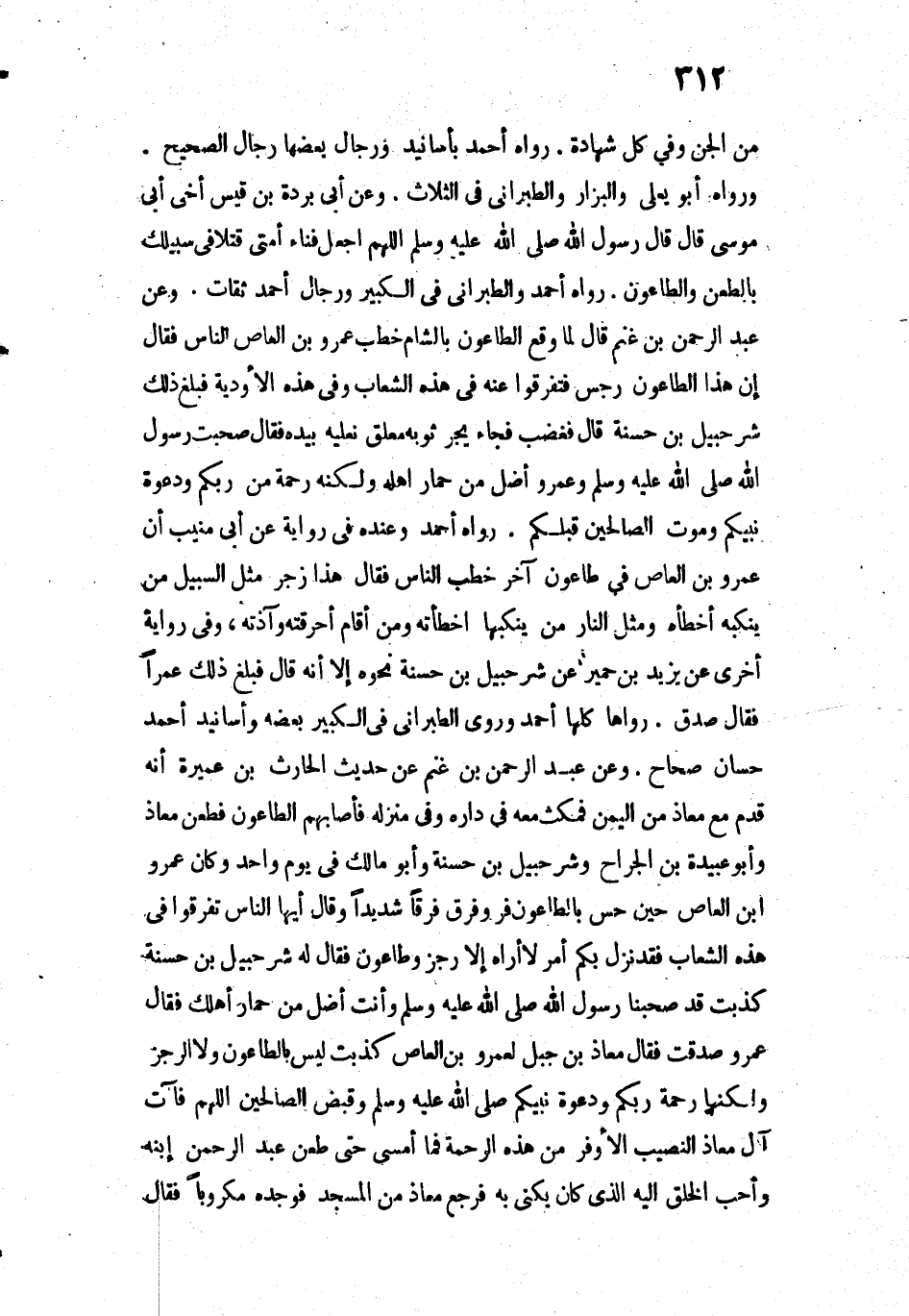 3860 - وَعَنْ عَبْدِ الرَّحْمَنِ بْنِ غَنْمٍ قَالَ: لَمَّا وَقَعَ الطَّاعُونُ بِالشَّامِ خَطَبَ عَمْرُو بْنُ الْعَاصِ النَّاسَ فَقَالَ: إِنَّ هَذَا الطَّاعُونَ رِجْسٌ فَتَفَرَّقُوا عَنْهُ فِي هَذِهِ الشِّعَابِ وَفِي هَذِهِ الْأَوْدِيَةِ، فَبَلَغَ ذَلِكَ شُرَحْبِيلَ بْنَ حَسَنَةَ قَالَ: فَغَضِبَ فَجَاءَ يَجُرُّ ثَوْبَهُ مُعَلِّقَ نَعْلَيْهِ بِيَدِهِ فَقَالَ: صَحِبْتُ رَسُولَ اللَّهِ - صَلَّى اللَّهُ عَلَيْهِ وَسَلَّمَ -، وَعَمْرٌو أَضَلُّ مِنْ حِمَارِ أَهْلِهِ وَلَكِنَّهُ رَحْمَةٌ [مِنْ رَ] بِّكُمْ وَدَعْوَةُ نَبِيِّكُمْ وَمَوْتُ الصَّالِحِينَ قَبْلَكُمْ.
