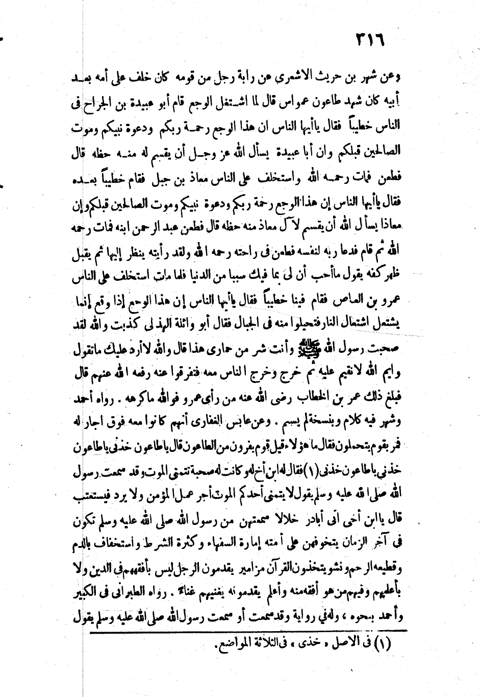 3875 - وَعَنْ شَهْرِ بْنِ حَوْشَبٍ الْأَشْعَرِيِّ عَنْ رَابِّهِ، رَجُلٍ مِنْ قَوْمِهِ كَانَ خَلَفَ عَلَى أُمِّهِ بَعْدَ أَبِيهِ كَانَ شَهِدَ طَاعُونَ عَمُوَاسَ قَالَ: لَمَّا اشْتَغَلَ الْوَجَعُ قَامَ أَبُو عُبَيْدَةَ بْنُ الْجَرَّاحِ فِي النَّاسِ خَطِيبًا فَقَالَ: يَا أَيُّهَا النَّاسُ إِنَّ هَذَا الْوَجَعَ رَحْمَةُ رَبِّكُمْ وَدَعْوَةُ نَبِيِّكُمْ وَمَوْتُ الصَّالِحِينَ قَبْلَكُمْ، وَإِنَّ أَبَا عُبَيْدَةَ يَسْأَلُ اللَّهَ - عَزَّ وَجَلَّ - أَنْ يَقْسِمَ لَهُ مِنْهُ حَظَّهُ قَالَ: فَطُعِنَ فَمَاتَ - رَحِمَهُ اللَّهُ - وَاسْتَخْلَفَ عَلَى النَّاسِ مُعَاذَ بْنَ جَبَلٍ فَقَامَ خَطِيبًا بَعْدَهُ فَقَالَ: يَا أَيُّهَا النَّاسُ إِنَّ هَذَا الْوَجَعَ رَحْمَةُ رَبِّكُمْ وَدَعْوَةُ نَبِيِّكُمْ وَمَوْتُ الصَّالِحِينَ قَبْلَكُمْ، وَإِنَّ مُعَاذًا يَسْأَلُ اللَّهَ أَنْ يَقْسِمَ لِآلِ مُعَاذٍ مِنْهُ حَظَّهُ قَالَ: فَطُعِنَ عَبْدُ الرَّحْمَنِ ابْنُهُ فَمَاتَ - رَحِمَهُ اللَّهُ -، ثُمَّ قَامَ فَدَعَا رَبَّهُ لِنَفْسِهِ فَطُعِنَ فِي رَاحَتِهِ - رَحِمَهُ اللَّهُ -، وَلَقَدْ رَأَيْتُهُ يَنْظُرُ إِلَيْهَا ثُمَّ يُقَبِّلُ ظَهْرَ كَفِّهِ يَقُولُ: مَا أُحِبُّ أَنَّ لِي بِمَا فِيكِ شَيْئًا مِنَ الدُّنْيَا فَلَمَّا مَاتَ اسْتُخْلِفَ عَلَى النَّاسِ عَمْرُو بْنُ الْعَاصِ، فَقَامَ فِينَا خَطِيبًا فَقَالَ: يَا أَيُّهَا النَّاسُ إِنَّ هَذَا الْوَجَعَ إِذَا وَقَعَ إِنَّمَا يَشْتَعِلُ اشْتِعَالَ النَّارِ فَتَجَبَّلُوا مِنْهُ فِي الْجِبَالِ فَقَالَ أَبُو وَائِلَةَ الْهُذَلِيُّ: كَذَبْتَ وَاللَّهِ لَقَدْ صَحِبْتُ رَسُولَ اللَّهِ - صَلَّى اللَّهُ عَلَيْهِ وَسَلَّمَ - وَأَنْتَ شَرٌّ مِنْ حِمَارِي هَذَا!! قَالَ: وَاللَّهِ لَا أَرُدُّ عَلَيْكَ مَا تَقُولُ - وَايْمُ اللَّهِ - لَا نُقِيمُ عَلَيْهِ، ثُمَّ خَرَجَ وَخَرَجَ النَّاسُ مَعَهُ فَتَفَرَّقُوا عَنْهُ وَدَفَعَهُ اللَّهُ عَنْهُمْ قَالَ: فَبَلَغَ ذَلِكَ عُمَرَ بْنَ الْخَطَّابِ - رَضِيَ اللَّهُ عَنْهُ - مِنْ رَأْيِ عَمْرٍو فَوَاللَّهِ مَا كَرِهَهُ.