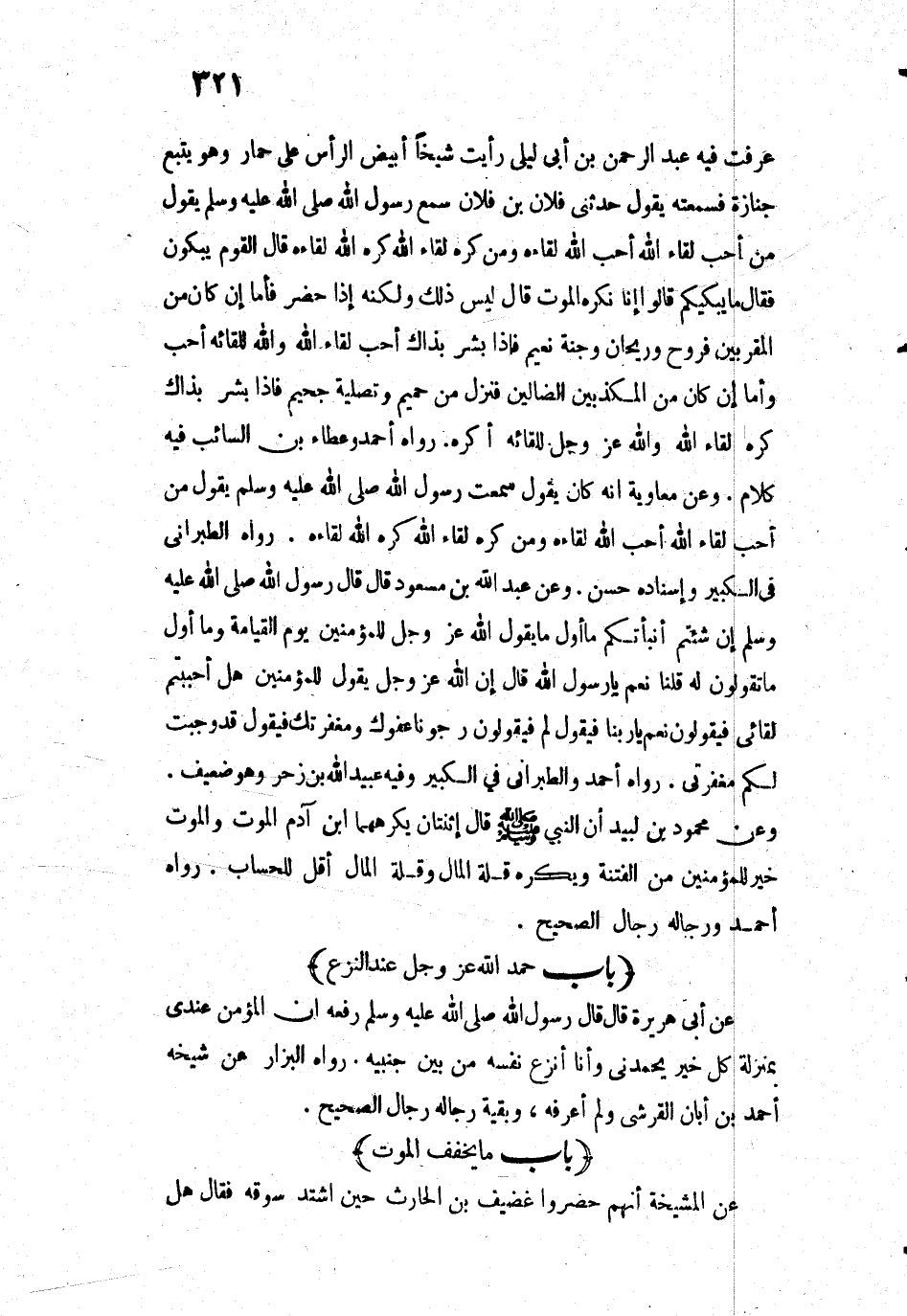 عَرَفْتُ فِيهِ عَبْدَ الرَّحْمَنِ بْنَ أَبِي لَيْلَى، رَأَيْتُ شَيْخًا أَبْيَضَ الرَّأْسِ عَلَى حِمَارٍ وَهُوَ يَتْبَعُ جِنَازَةً فَسَمِعْتُهُ يَقُولُ: حَدَّثَنِي فُلَانُ بْنُ فُلَانٍ سَمِعَ رَسُولَ اللَّهِ - صَلَّى اللَّهُ عَلَيْهِ وَسَلَّمَ - يَقُولُ: " مَنْ أَحَبَّ لِقَاءَ اللَّهِ أَحَبَّ اللَّهُ لِقَاءَهُ، وَمَنْ كَرِهَ لِقَاءَ اللَّهِ كَرِهَ اللَّهُ لِقَاءَهُ " قَالَ: الْقَوْمُ يَبْكُونَ!! فَقَالَ: " مَا يُبْكِيكُمْ؟ " قَالُوا: إِنَّا نَكْرَهُ الْمَوْتَ!! قَالَ: " لَيْسَ ذَلِكَ وَلَكِنَّهُ إِذَا حُضِرَ فَأَمَّا إِنْ كَانَ مِنَ الْمُقَرَّبِينَ {فَرَوْحٌ وَرَيْحَانٌ وَجَنَّةُ نَعِيمٍ} [الواقعة: 89] فَإِذَا بُشِّرَ بِذَاكَ أَحَبَّ لِقَاءَ اللَّهِ وَاللَّهُ لِلِقَائِهِ أَحَبُّ، {وَأَمَّا إِنْ كَانَ مِنَ الْمُكَذِّبِينَ الضَّالِّينَ - فَنُزُلٌ مِنْ حَمِيمٍ - وَتَصْلِيَةُ جَحِيمٍ} [الواقعة: 92 - 94] فَإِذَا بُشِّرَ بِذَاكَ كَرِهَ لِقَاءَ اللَّهِ، وَاللَّهُ - عَزَّ وَجَلَّ - لِلِقَائِهِ أَكْرَهُ».