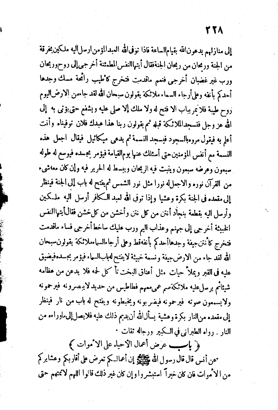 إِلَى مَنَازِلِهِمْ يَدْعُونَ اللَّهَ بِقِيَامِ السَّاعَةِ فَإِذَا تَوَفَّى اللَّهُ الْعَبْدَ الْمُؤْمِنَ أَرْسَلَ إِلَيْهِ مَلَكَيْنِ بِخِرْقَةٍ مِنَ الْجَنَّةِ وَرَيْحَانٍ مِنْ رَيْحَانِ الْجَنَّةِ فَقَالَ: أَيَّتُهَا النَّفْسُ الْمُطْمَئِنَّةُ اخْرُجِي إِلَى رَوْحٍ وَرَيْحَانٍ وَرَبٍّ غَيْرِ غَضْبَانَ، اخْرُجِي فَنِعْمَ مَا قَدَّمْتِ فَتَخْرُجُ كَأَطْيَبِ رَائِحَةِ مِسْكٍ وَجَدَهَا أَحَدُكُمْ بِأَنْفِهِ وَعَلَى أَرْجَاءِ السَّمَاءِ مَلَائِكَةٌ يَقُولُونَ: سُبْحَانَ اللَّهِ لَقَدْ جَاءَ مِنَ الْأَرْضِ الْيَوْمَ رُوحٌ طَيِّبَةٌ فَلَا يَمُرُّ بِبَابٍ إِلَّا فَتَحَ لَهُ وَلَا مَلَكٍ إِلَّا صَلَّى عَلَيْهِ وَيَشْفَعُ حَتَّى يُؤْتَى بِهِ إِلَى اللَّهِ - عَزَّ وَجَلَّ - فَتَسْجُدُ الْمَلَائِكَةُ قَبْلَهُ ثُمَّ يَقُولُونَ: رَبَّنَا هَذَا عَبْدُكَ فُلَانٌ تَوَفَّيْنَاهُ وَأَنْتَ أَعْلَمُ بِهِ فَيَقُولُ: مُرُوهُ بِالسُّجُودِ فَيَسْجُدُ النَّسَمَةُ ثُمَّ يُدْعَى مِيكَائِيلُ فَيُقَالُ: اجْعَلْ هَذِهِ النَّسَمَةَ مَعَ أَنْفُسِ الْمُؤْمِنِينَ حَتَّى أَسْأَلَكَ عَنْهَا يَوْمَ الْقِيَامَةِ فَيُؤْمَرُ بِجَسَدِهِ فَيُوَسِّعُ لَهُ، طُولُهُ سَبْعُونَ وَعَرْضُهُ سَبْعُونَ وَيَنْبِذُ فِيهِ الرَّيْحَانَ وَيَبْسُطُ لَهُ الْحَرِيرَ فِيهِ، وَإِنْ كَانَ مَعَهُ شَيْءٌ مِنَ الْقُرْآنِ نَوَّرَهُ وَإِلَّا جُعِلَ لَهُ نُورًا مِثْلَ نُورِ الشَّمْسِ ثُمَّ يُفْتَحُ لَهُ بَابٌ إِلَى الْجَنَّةِ فَيَنْظُرُ إِلَى مَقْعَدِهِ فِي الْجَنَّةِ بُكْرَةً وَعَشِيًّا.