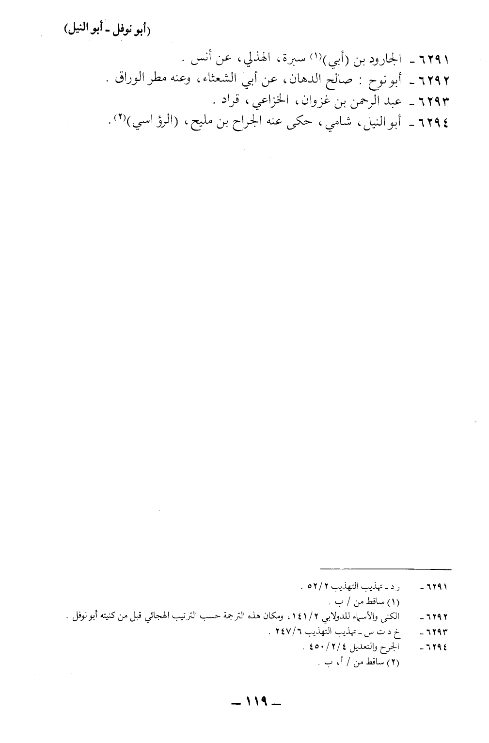 6292-*الكنى والأسماء للدولابي 2/141، ومكان هذه الترجمة حسب الترتيب الهجائي قبل من كنيته: أبو نوفل.