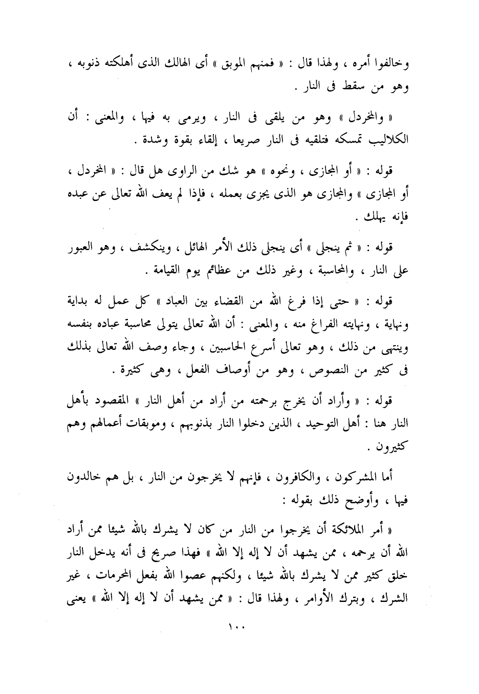((أمر الملائكة أن يخرجوا من النار من كان لا يشرك بالله شيئاً ممن أراد الله أن يرحمه، ممن يشهد أن لا إله إلا الله)) فهذا صريح في أنه يدخل النار خلق كثير ممن لا يشرك بالله شيئاً، ولكنهم عصوا الله بفعل المحرمات، غير الشرك، وبترك الأوامر، ولهذا قال: ((ممن يشهد أن لا إله إلا الله)) يعني: