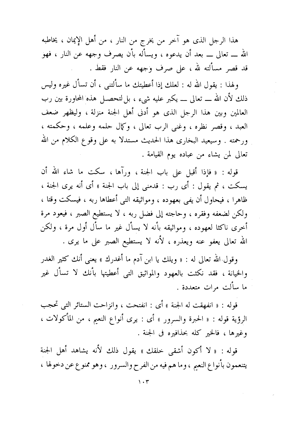 ولهذا يقول الله له: لعلك إذا أعطيتك ما سألتني، أن تسأل غيره، وليس ذلك لأن الله - تعالى - يكبر عليه شيء، بل لتحصل هذه المحاورة بين رب العالمين وبين هذا الرجل الذي هو أدنى أهل الجنة منزلة، وليظهر ضعف العبد، وقصر نظره، وغنى الرب - تعالى -، وكمال حلمه وعلمه، وحكمته ورحمته، وسيعيد البخاري هذا الحديث مستدلاً به على وقوع الكلام من الله - تعالى - لمن يشاء من عباده يوم القيامة.