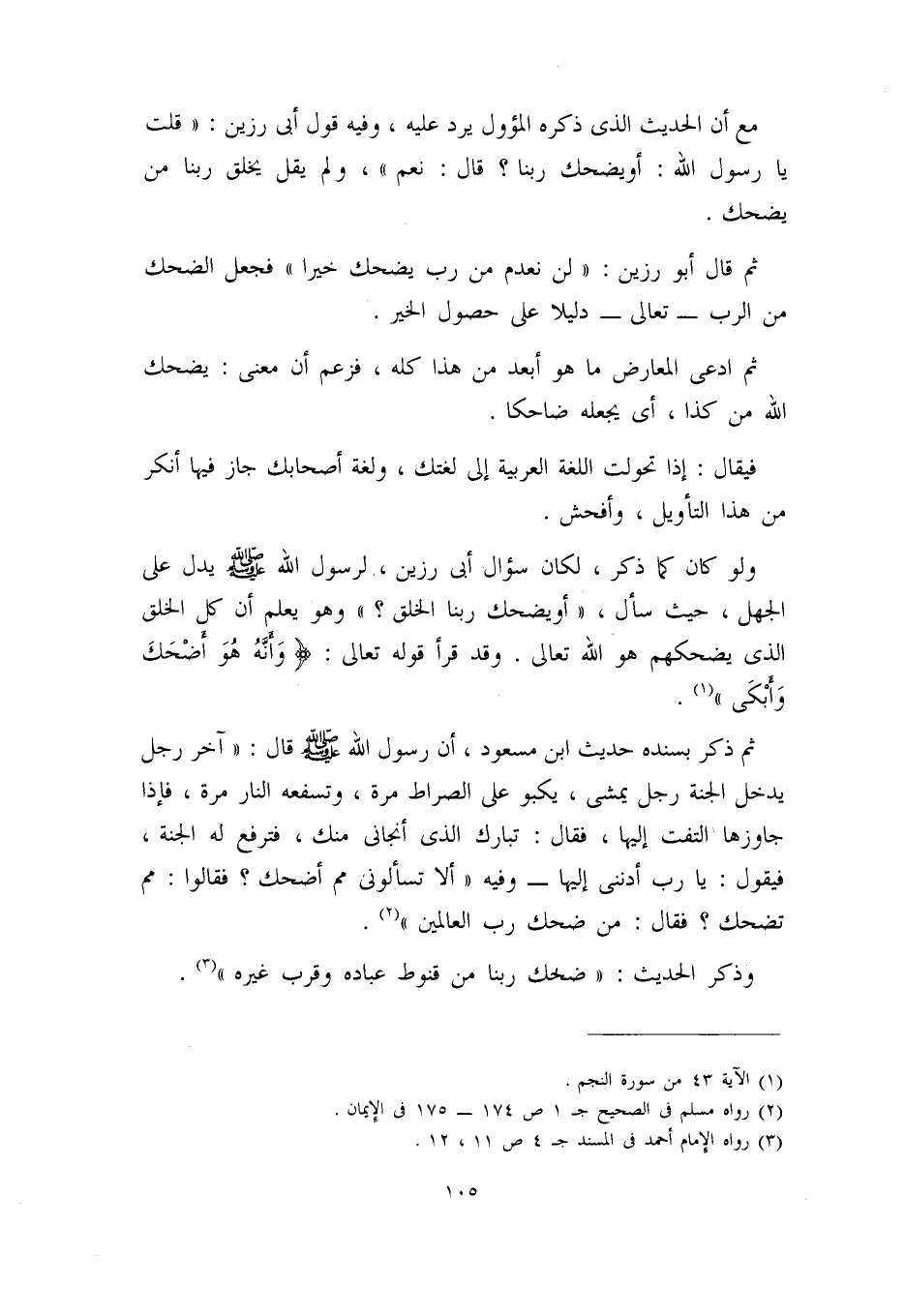 مع أن الحديث الذي ذكره المؤول يرد عليه، وفيه قول أبي رزين: ((قلت: يا رسول الله، أو يضحك ربنا؟ قال: نعم)) ، ولم يقل: يخلق ربنا من يضحك.