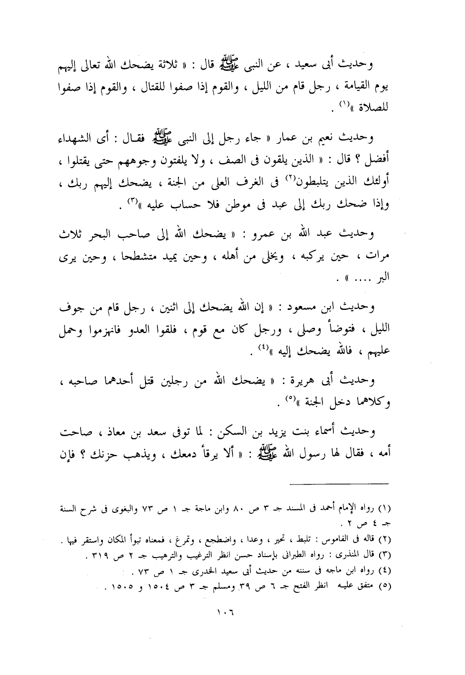 وحديث ابن مسعود: ((إن الله يضحك إلى اثنين: رجل قام من جوف الليل، فتوضأ وصلى، ورجل كان مع قوم، فلقوا العدو فانهزموا وحمل عليهم، فالله يضحك إليه)) (¬4) .
