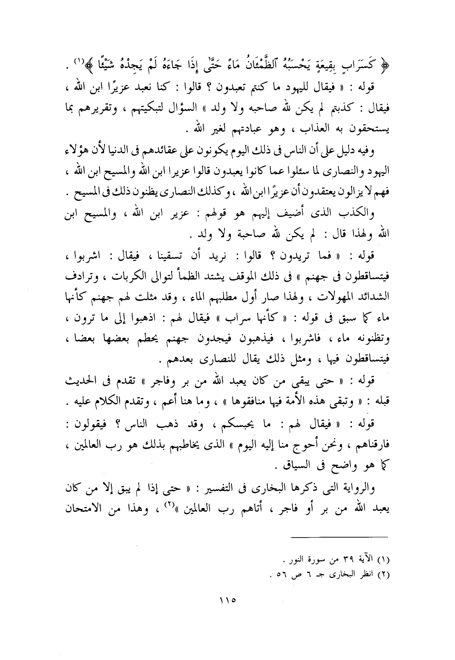 وفيه دليل على أن الناس في ذلك اليوم يكونون على عقائدهم في الدنيا؛ لأن هؤلاء اليهود والنصارى لما سئلوا عما كانوا يعبدون قالوا: عزيزاً ابن الله والمسيح ابن الله، فهم لا يزالون يعتقدون أن عزيزاً ابن الله، وكذلك النصارى يظنون ذلك في المسيح.