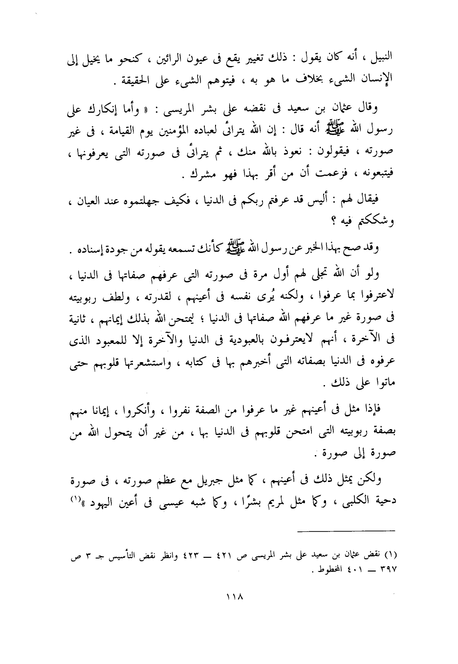 وقال عثمان بن سعيد في نقضه على بشر المريسي: ((وأما إنكارك على رسول الله – صلى الله عليه وسلم - أنه قال: إن الله يتراءى لعباده المؤمنين يوم القيامة، في غير صورته، فيقولون: نعوذ بالله منك، ثم يتراءى في صورته التي يعرفونها، فيتبعونه، فزعمت أن من أقر بهذا فهو مشرك.