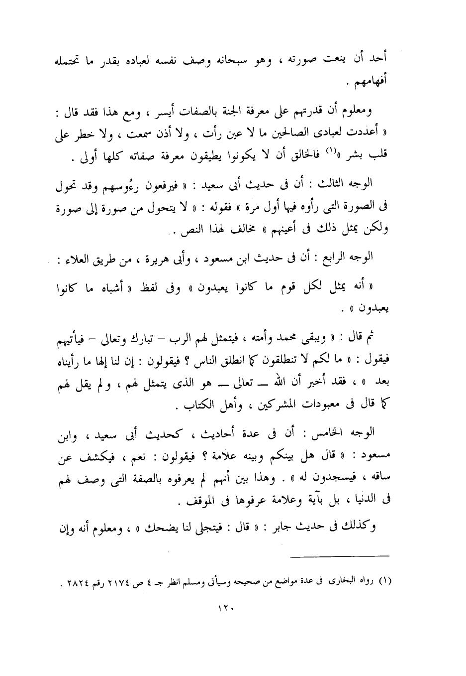 الوجه الخامس: أن في عدة أحاديث، كحديث أبي سعيد، وابن مسعود: ((قال: هل بينكم وبينه علامة؟ فيقولون: نعم، فيكشف عن ساقه، فيسجدون له)) . وهذا بيِّن أنهم لم يعرفوه بالصفة التي وصف لهم في الدنيا، بل بآية وعلامة عرفوها في الموقف.