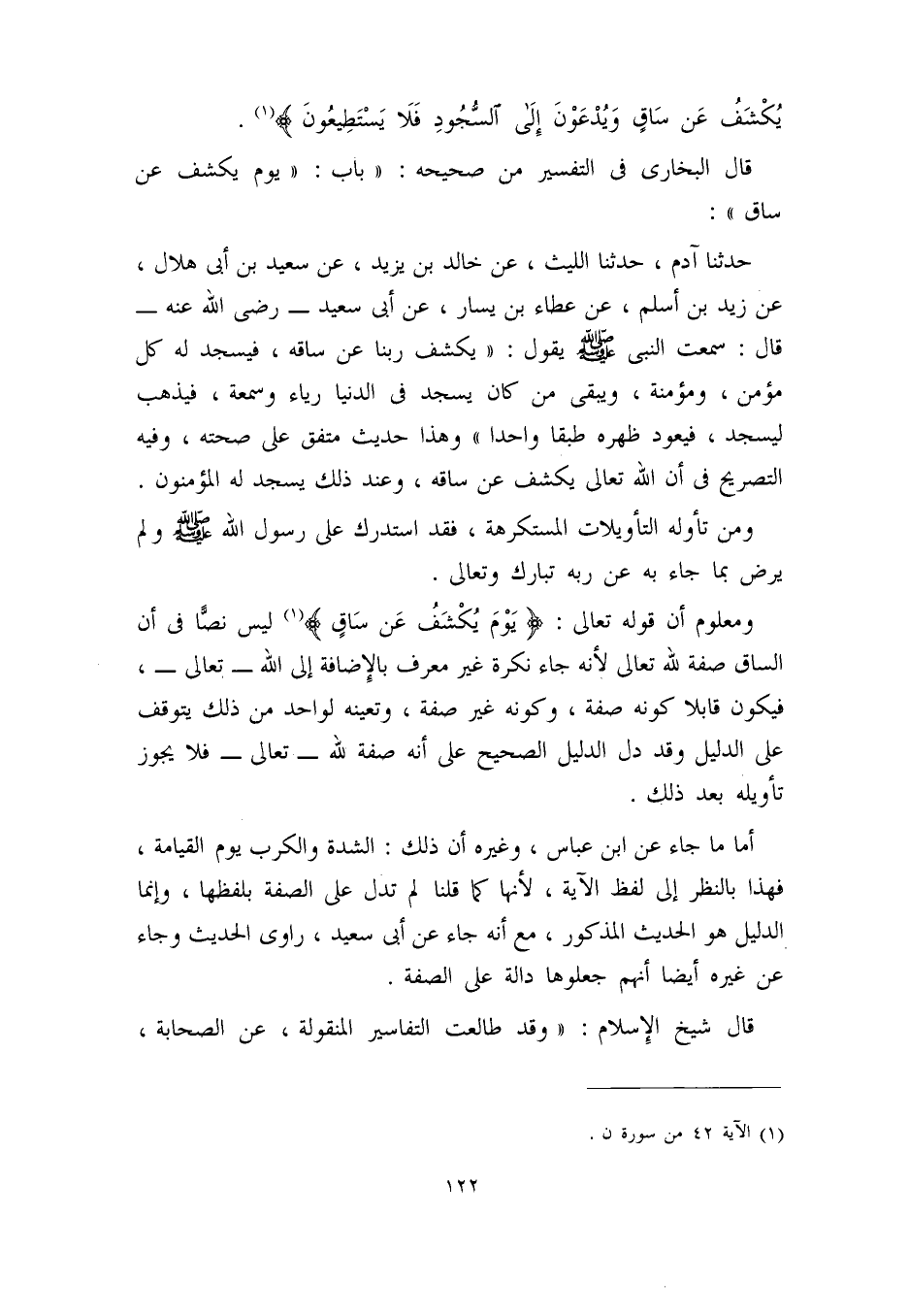 حدثنا آدم، حدثنا الليث، عن خالد بن يزيد، عن سعيد بن أبي هلال، عن زيد ابن أسلم، عن عطاء بن يسار، عن أبي سعيد – رضي الله عنه _ قال: سمعت النبي – صلى الله عليه وسلم – يقول: ((يكشف ربنا عن ساقه، فيسجد له كل مؤمن، ومؤمنة، ويبقى من كان يسجد في الدنيا رياء وسمعة، فيذهب ليسجد، فيعود ظهره طبقاً واحداً)) وهذا حديث متفق على صحته، وفيه التصريح في أن الله تعالى يكشف عن ساقه، وعند ذلك يسجد له المؤمنون.