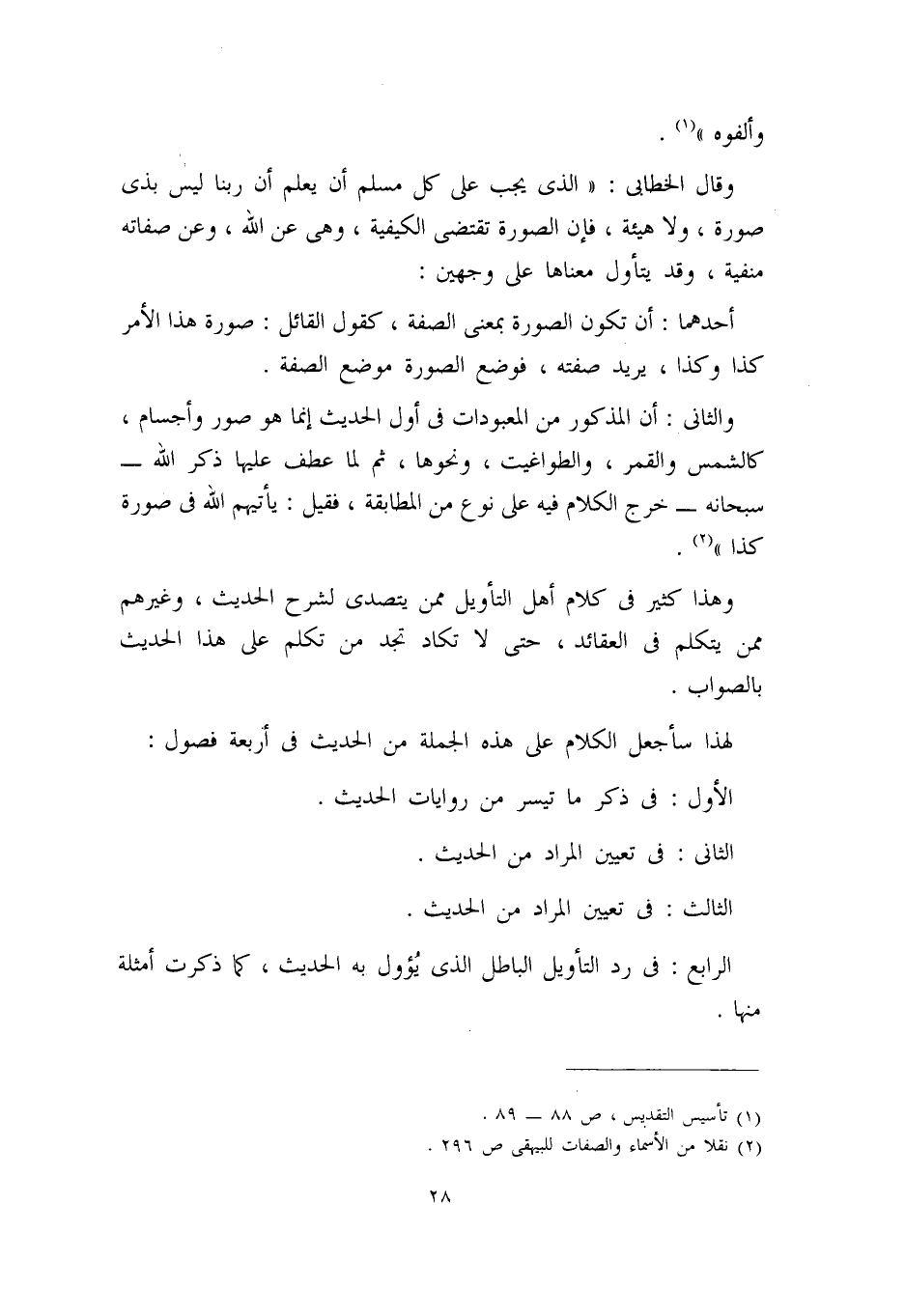 وقال الخطابي: ((الذي يجب على كل مسلم أن يعلم أن ربنا ليس بذي صورة, ولا هيئة, فإن الصورة تقتضي الكيفية, وهي عن الله وعن صفاته منفية, وقد يتأول معناها على وجهين: