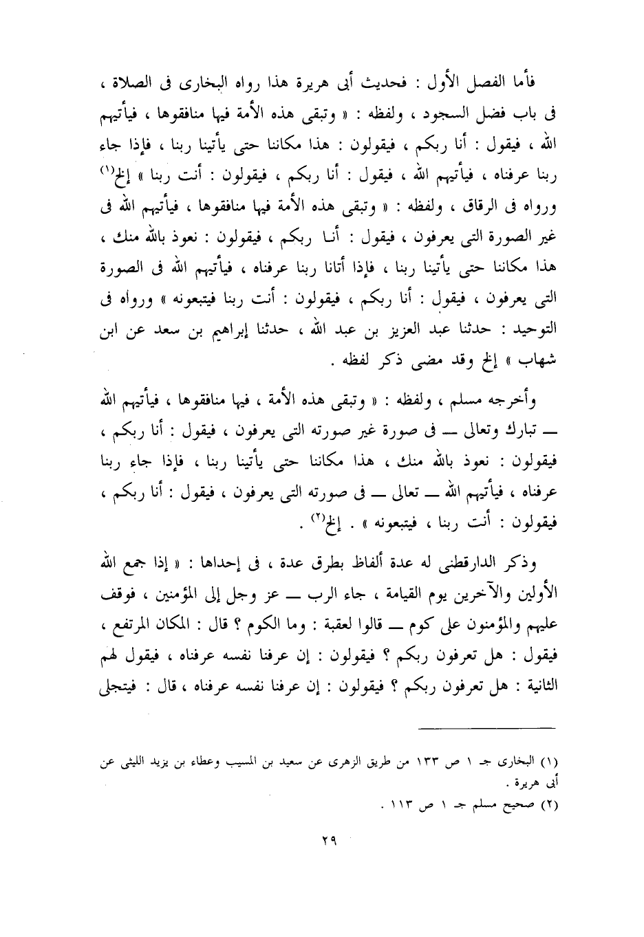 فحديث أبي هريرة هذا رواه البخاري في الصلاة, في باب فضل السجود, ولفظه: ((وتبقى هذه الأمة فيها منافقوها, فيأتيهم الله, فيقول: أنا ربكم, فيقولون: هذا مكاننا حتى يأتينا ربنا، فإذا جاء ربنا عرفناه، فيأتيهم الله، فيقول: أنا ربكم، فيقولون: أنت ربنا)) إلخ (¬1) .