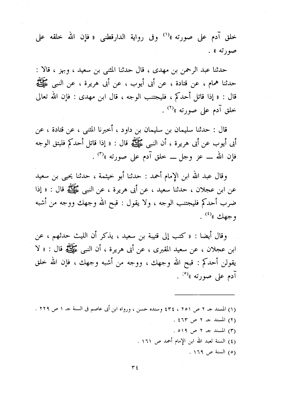 حدثنا عبد الرحمن بن مهدي, قال: حدثنا المثنى بن سعيد, وبهز, قالا: حدثنا همام, عن قتادة, عن أبي أيوب, عن أبي هريرة, عن النبي – صلى الله عليه وسلم – قال: ((إذا قاتل أحدكم, فليجتنب الوجه, قال ابن المهدي: فإن الله – تعالى – خلق آدم على صورته)) (¬2) .