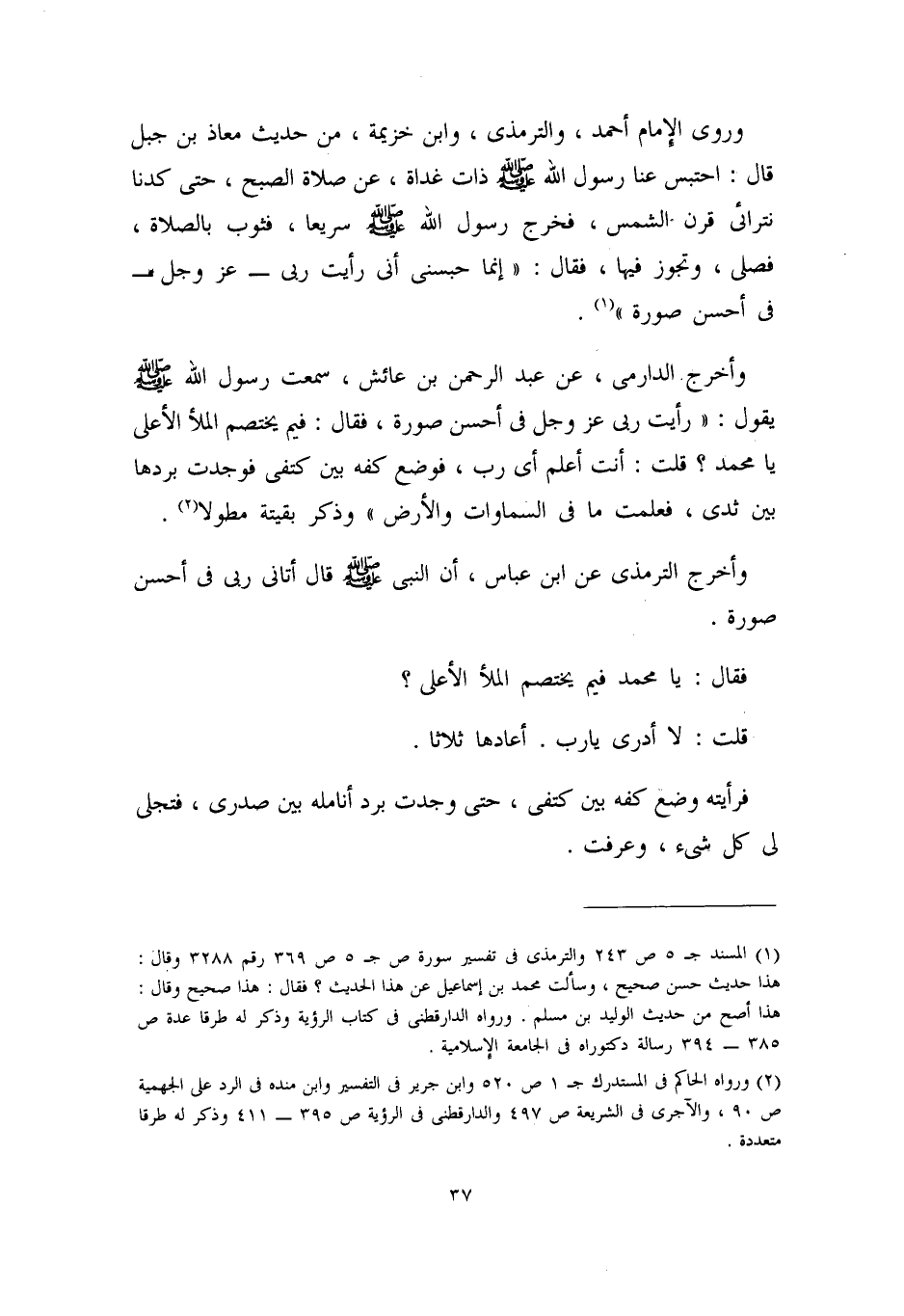 وأخرج الترمذي عن ابن عباس, أن النبي – صلى الله عليه وسلم – قال: ((أتاني ربي في أحسن صورة, فقال: يا محمد, فيم يختصم الملأ الأعلى؟ قلت: لا أدري يا رب – أعادها ثلاثاً – فرأيته وضع كفه بين كتفي, حتى وجدت برد أنامله بين صدري, فتجلى لي كل شيء وعرفت,