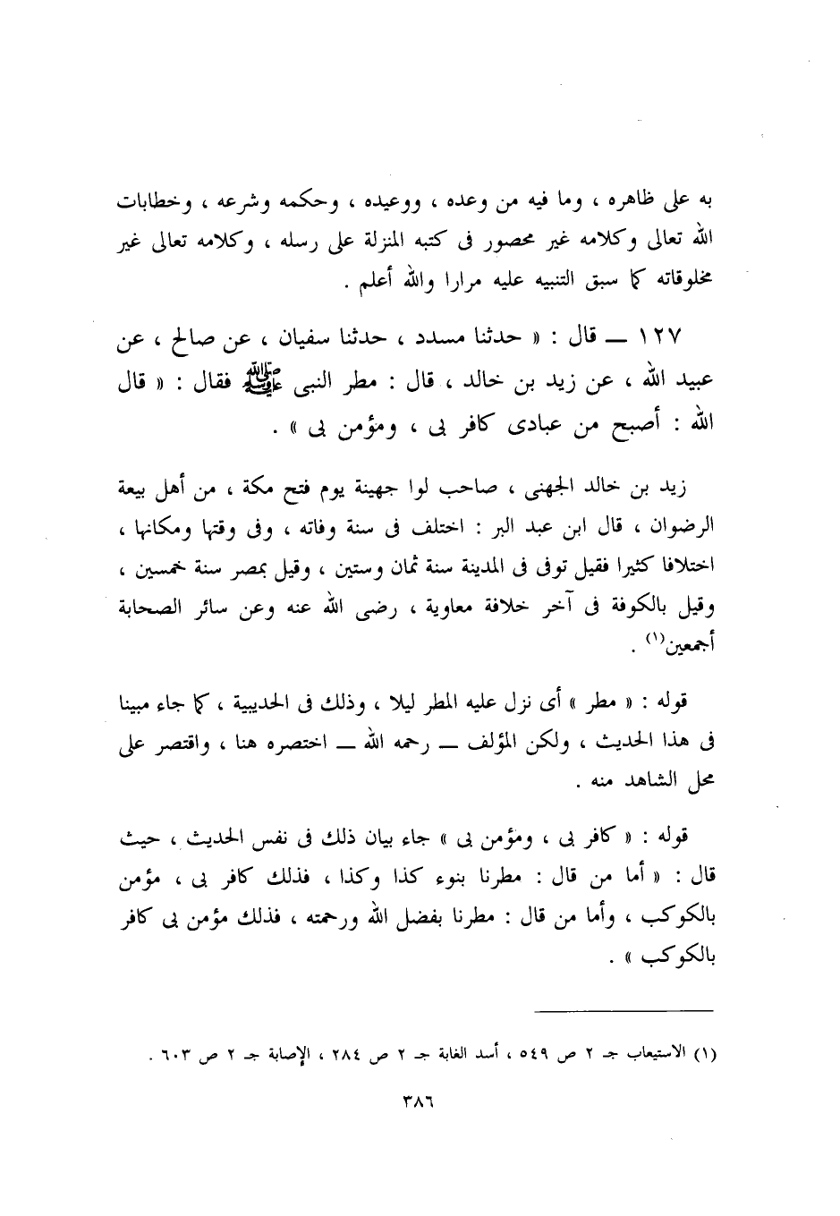 129- قال: ((حدثنا مسدد، حدثنا سفيان، عن صالح، عن عبيد الله، عن زيد ابن خالد، قال: مطر النبي - صلى الله عليه وسلم - فقال: (قال الله: أصبح من عبادي كافر بي، ومؤمن بي)) .