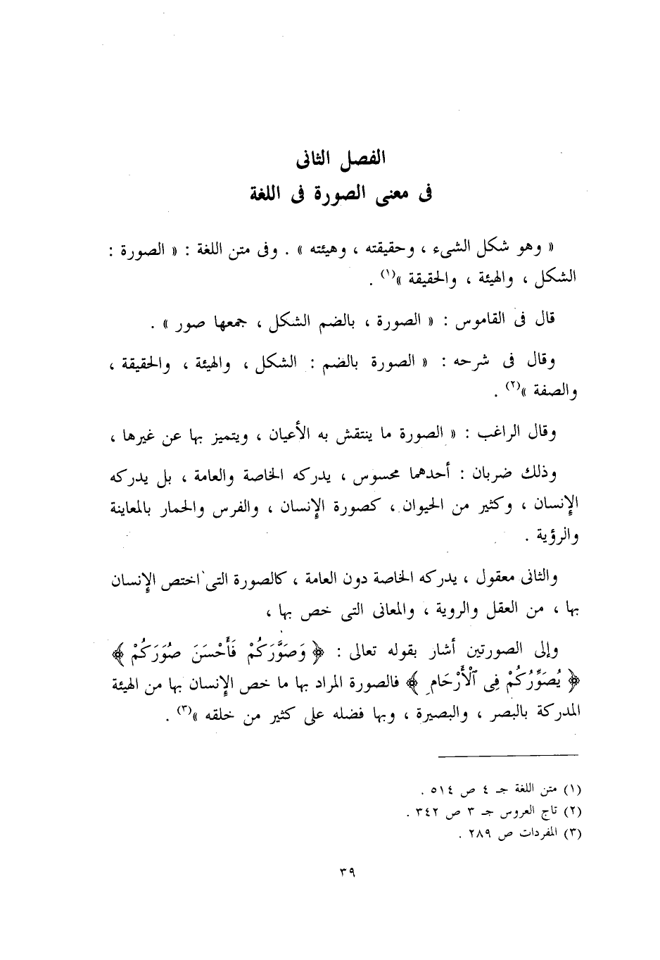 ((وهو شكل الشيء, وحقيقته, وهيئته)) , وفي متن اللغة: ((الصورة: الشكل, والهيئة, والحقيقة)) (¬1) .