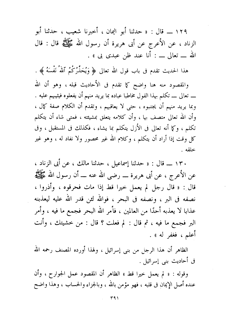 132- قال: ((حدثنا إسماعيل، حدثنا مالك، عن أبي الزناد، عن الأعرج، عن أبي هريرة رضي الله عنه - أن رسول الله - صلى الله عليه وسلم - قال: ((قال رجل لم يعمل خيراً قط: إذا مات فحرقوه، واذروا نصفه في البر، ونصفه في البحر، فو الله لئن قدر الله عليه ليعذبنه عذاباً لا يعذبه أحداً من العالمين، فأمر الله البحر فجمع ما فيه، وأمر البر فجمع ما فيه، ثم قال: لم فعلت؟ قال: من خشيتك، وأنت أعلم، فغفر له)) .