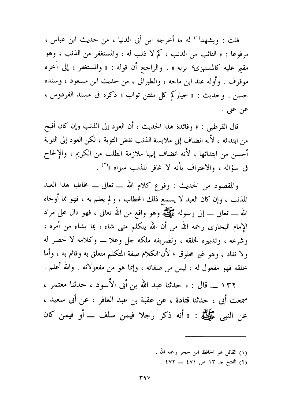 قلت (¬1) : ويشهد له ما أخرجه ابن أبي الدنيا، من حديث ابن عباس، مرفوعاً: ((التائب من الذنب، كمن لا ذنب له، والمستغفر من الذنب وهو مقيم عليه كالمستهزئ بربه)) . والراجح أن قوله: (والمستغفر)) إلى آخره، موقوف. وأوله عند ابن ماجه، والطبراني، من حديث ابن مسعود، وسنده حسن. وحديث: ((خياركم كل مفتن تواب)) ذكره في مسند الفردوس، عن علي.