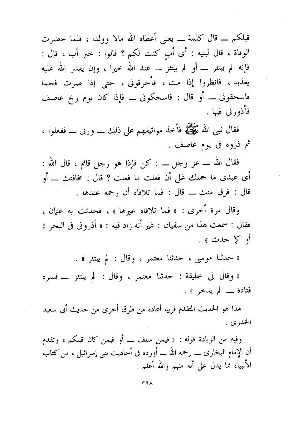 وقال مرة أخرى: ((فما تلافاه غيرها)) فحدثت به أبا عثمان، فقال: سمعت هذا من سلمان، غير أنه زاد فيه: ((أذروني في البحر)) أو كما حدث)) .