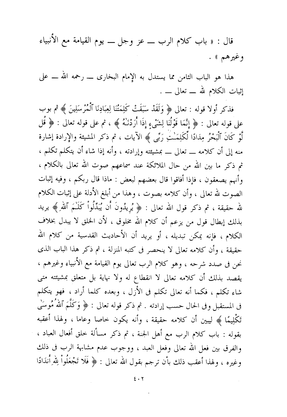 فذكر أولاً قوله - تعالى -: {وَلَقَد سَبَقَت كَلِمَتُنَا لِعبَادِنَا المُرسِلينَ} ثم بوب على قوله تعالى: - {إِنَّمَا قَولُنَا إِذَا لَشَيْءٌ أَرَدناهُ} ، ثم على قوله تعالى: - {قُل لَّو كَانَ البَحرُ مِدَادَاً لِكَلمَاتِ رَبّي} الآيات، ثم ذكر المشيئة والإرادة إشارة منه إلى أن كلامه - تعالى - بمشيئته وإرادته، وأنه إذا شاء أن يتكلم تكلم، ثم ذكر ما بيَّن الله من حال الملائكة عند سماعهم صوت الله - تعالى - بالكلام، وأنهم يصعقون، فإذا أفاقوا قال بعضهم لبعض: ماذا قال ربكم، وفيه إثبات الصوت لله - تعالى-، وأن كلامه بصوت، وهذا من أبلغ الأدلة على إثبات الكلام لله حقيقة، ثم ذكر قول الله - تعالى -: {يُرِيدُونَ أَن يُبَدِّلُوا كَلامَ اللَّهِ} يريد بذلك إبطال قول من يزعم أن كلام الله مخلوق؛ لأن الخلق لا يبدل بخلاف الكلام، فإنه يمكن تبديله، أو يريد أن الأحاديث القدسية من كلام الله حقيقة، وأن كلامه تعالى لا ينحصر في كتبه المنزلة، ثم ذكر هذا الباب الذي نحن في صدد شرحه، وهو كلام الرب تعالى يوم القيامة مع الأنبياء وغيرهم، يقصد بذلك أن كلامه تعالى لا انقطاع له ولا نهاية بل متعلق بمشيئته متى شاء تكلم، فكما أنه تعالى تكلم في الأزل، وبعده كلما أراد، فهو يتكلم في المستقبل وفي الحال حسب إرادته.