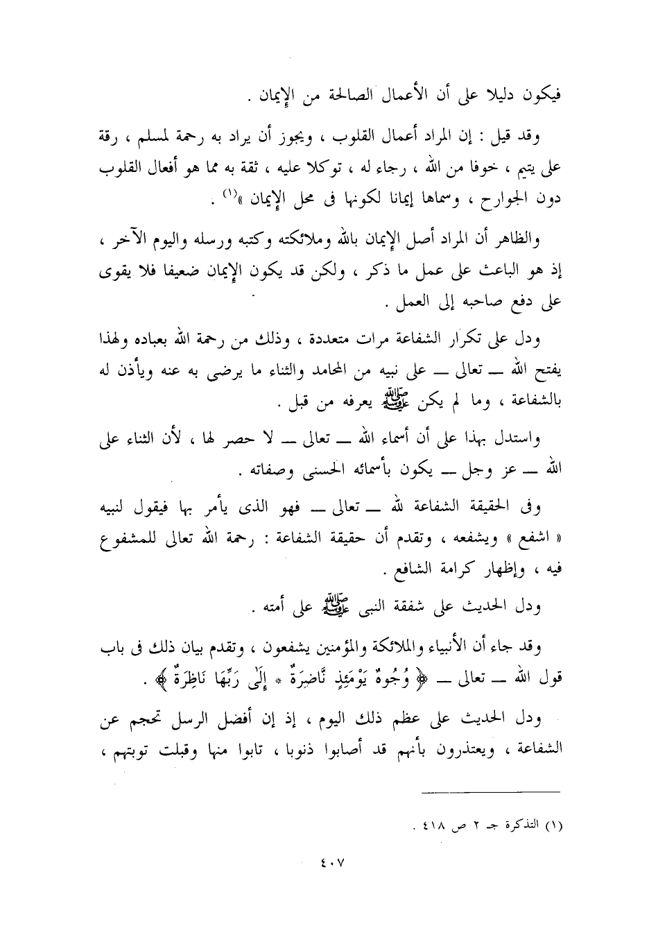 وقد قيل: إن المراد: أعمال القلوب، ويجوز أن يراد به: رحمة لمسلم، رقة على يتيم، خوفاً من الله، رجاء له، توكلاً عليه، ثقة به، مما هو أفعال القلوب دون الجوارح، وسماها إيماناً؛ لكونها في محل الإيمان)) (¬1) .
