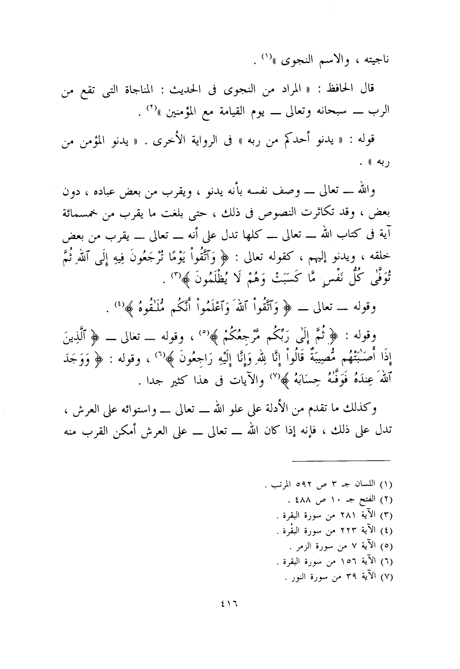 والله - تعالى - وصف نفسه بأنه يدنو، ويقرب من بعض عباده، دون بعض، وقد تكاثرت النصوص في ذلك، حتى بلغت ما يقرب من خمسمائة آية في كتاب الله – تعالى -، كلها تدل على أنه – تعالى - يقرب من بعض خلقه، ويدنو إليهم، كقوله تعالى: {وَاتَّقُواْ يَوْمًا تُرْجَعُونَ فِيهِ إِلَى اللهِ ثُمَّ تُوَفَّى كُلُّ نَفْسٍ مَّا كَسَبَتْ وَهُمْ لاَ يُظْلَمُونَ} (¬3) .
