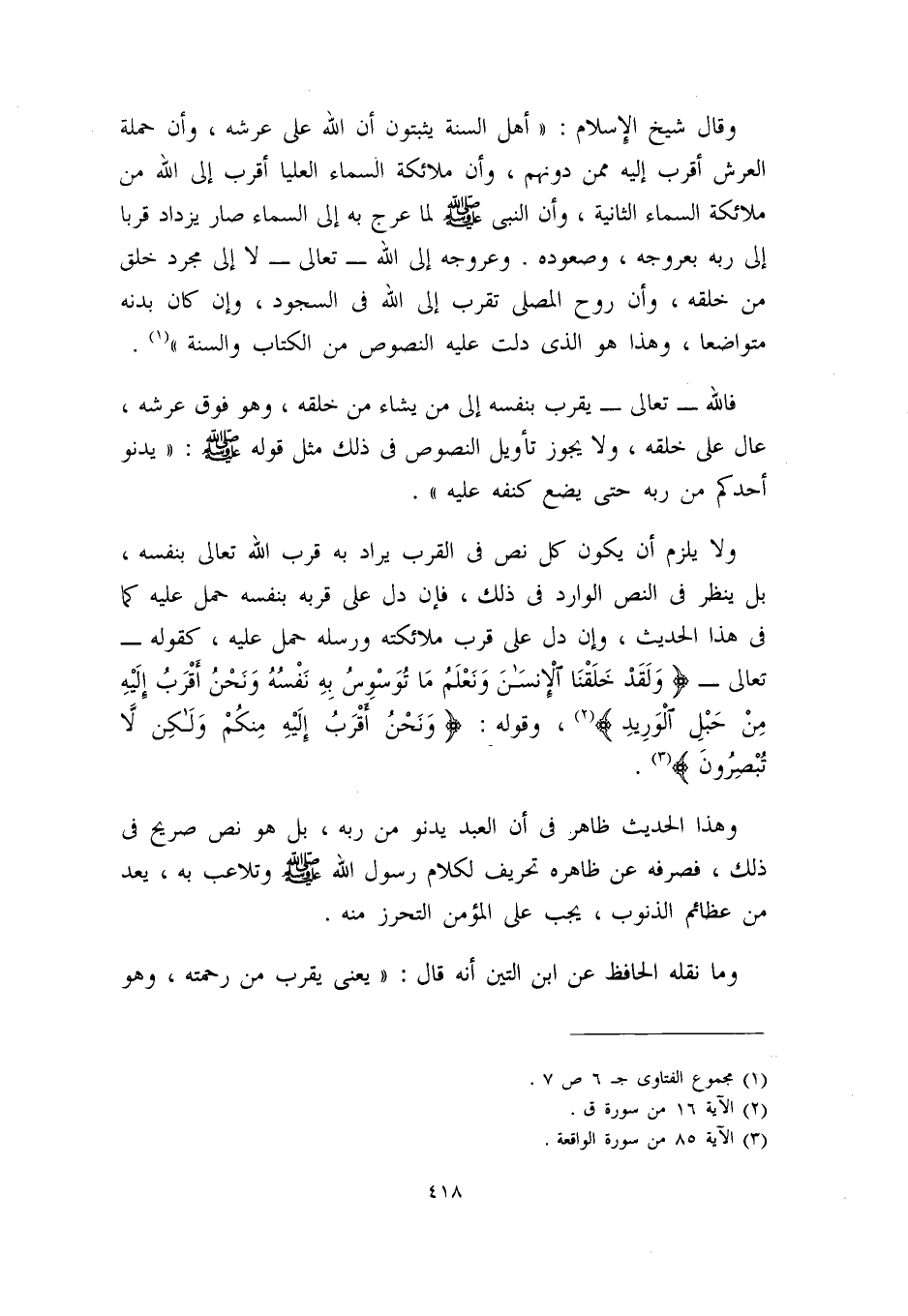 وقال شيخ الإسلام: ((أهل السُّنَّة يثبتون أن الله على عرشه، وأن حملة العرش أقرب إليه ممن دونهم، وأن ملائكة السماء العليا أقرب إلى الله من ملائكة السماء الثانية، وأن النبي – صلى الله عليه وسلم – لما عرج به إلى السماء صار يزداد قرباً إلى ربه بعروجه، وصعوده. وعروجه إلى الله – تعالى – لا إلى مجرد خلق من خلقه، وأن روح المصلي تقرب إلى الله في السجود، وإن كان بدنه متواضعاً، وهذا هو الذي دلت عليه النصوص من الكتاب والسُّنَّة)) (¬1) .