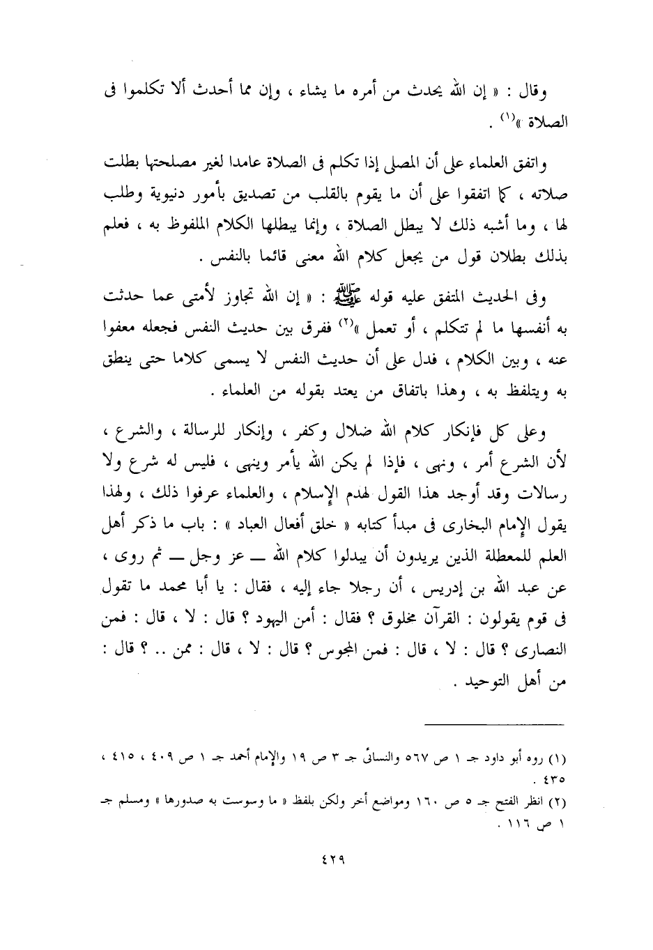 واتفق العلماء على أن المصلي إذا تكلم في الصلاة عامداً لغير مصلحتها بطلت صلاته، كما اتفقوا على أن ما يقوم بالقلب من تصديق بأمور دنيوية وطلب لها، وما أشبه ذلك لا يبطل الصلاة، وإنما يبطلها الكلام الملفوظ به، فعلم بذلك بطلان قول من يجعل كلام الله معنى قائماً بالنفس.
