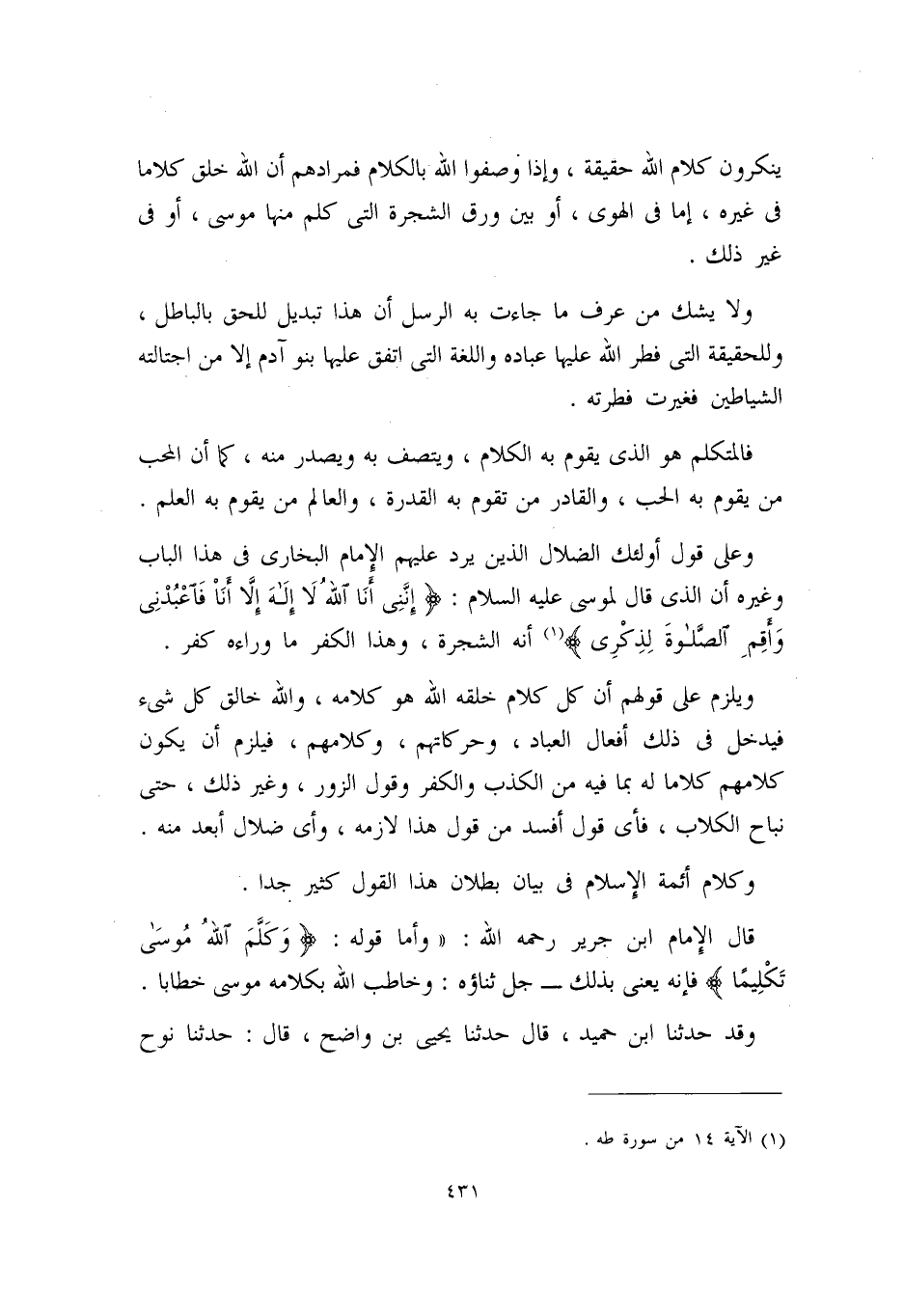 وعلى قول أولئك الضلاّل الذين يرد عليهم الإمام البخاري في هذا الباب وغيره، أن الذي قال لموسى عليه السلام: {إِنَّنِي أَنَا اللَّهُ لا إِلَهَ إِلاَّ أَنَا فَاعْبُدْنِي وَأَقِمِ الصَّلاةَ لِذِكْرِي} (¬1) أنه الشجرة، وهذا الكفر ما وراءه كفر.