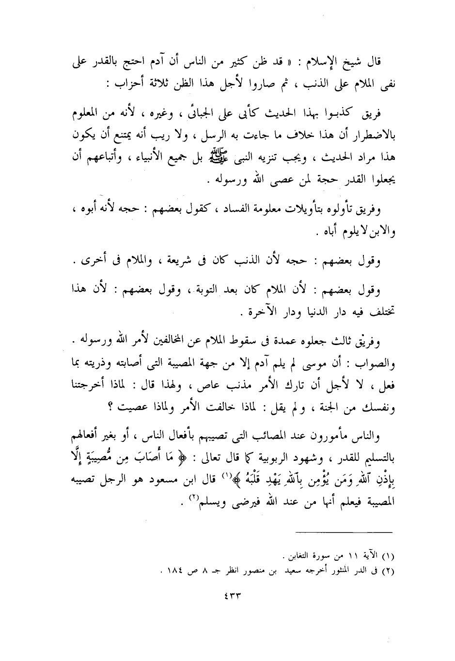 قال شيخ الإسلام: ((قد ظن كثير من الناس أن آدم احتج بالقدر على نفي الملام على الذنب، ثم صاروا لأجل هذا الظن ثلاث أحزاب: